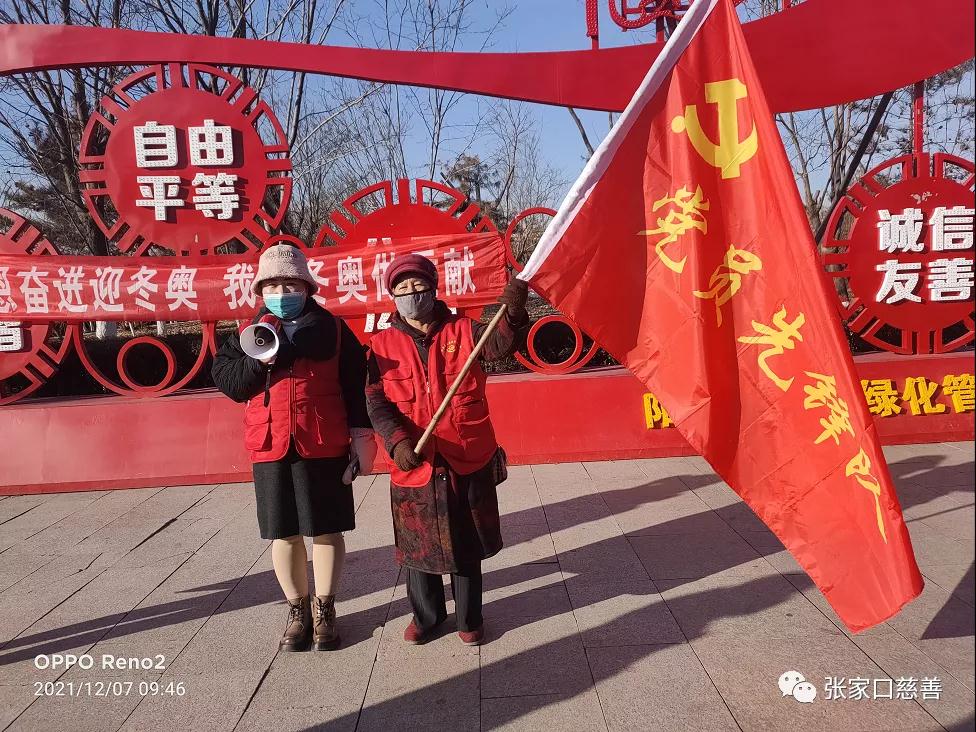 2021年12月7日,阳原县爱国拥军联合会田广阔会长组织志愿者,8点整到达泥河湾广场,用喇叭演讲宣传,用发传单形式宣传,深入学习宣传贯彻落实习近平总书记关于北京2021年冬奥会和冬残会筹办工作的重要指示精神,切实落实张家口慈善义工联合会党委关于“相约冬奥一扛红旗、当先锋”的倡议,阳原县爱国拥军联合会开展“相约冬奥一扛红旗、当先锋”系列活动,志愿者每天都想着怎样才能为我们的家乡——阳原,做一些力所能及的事。