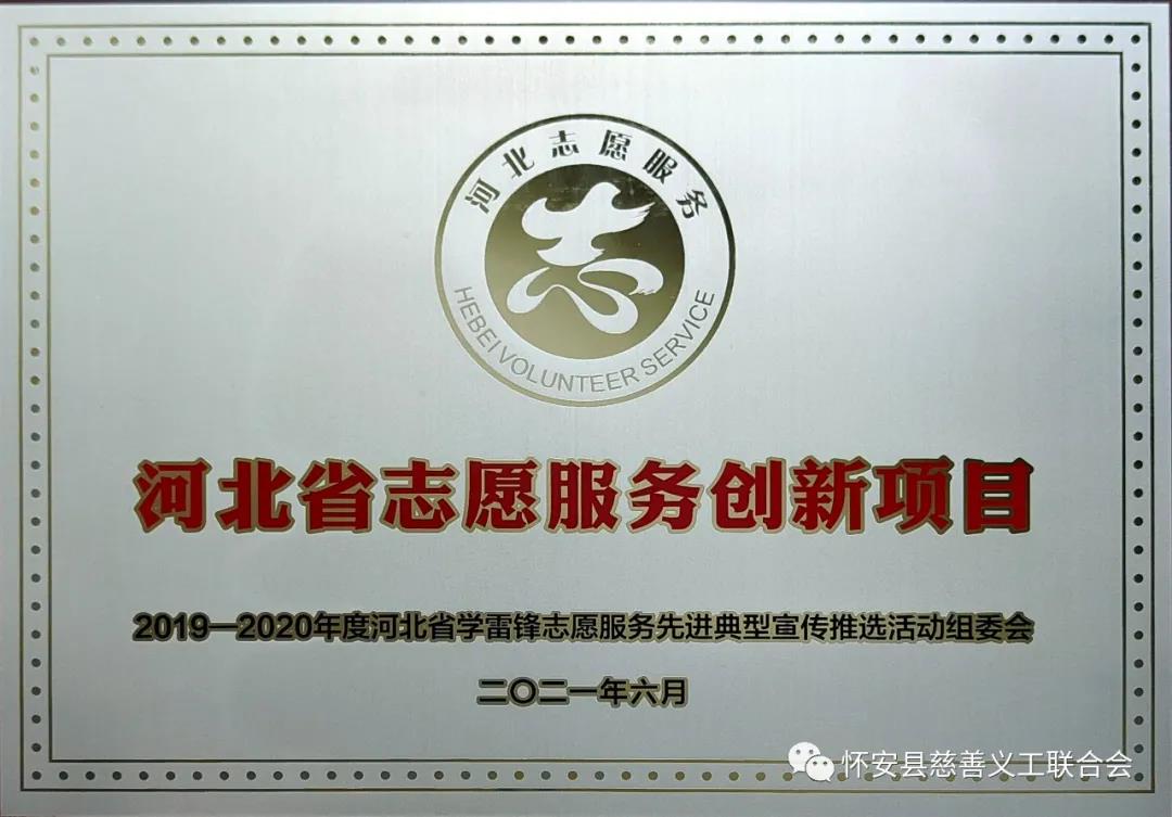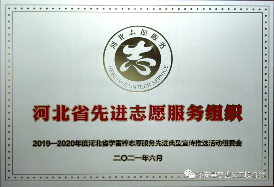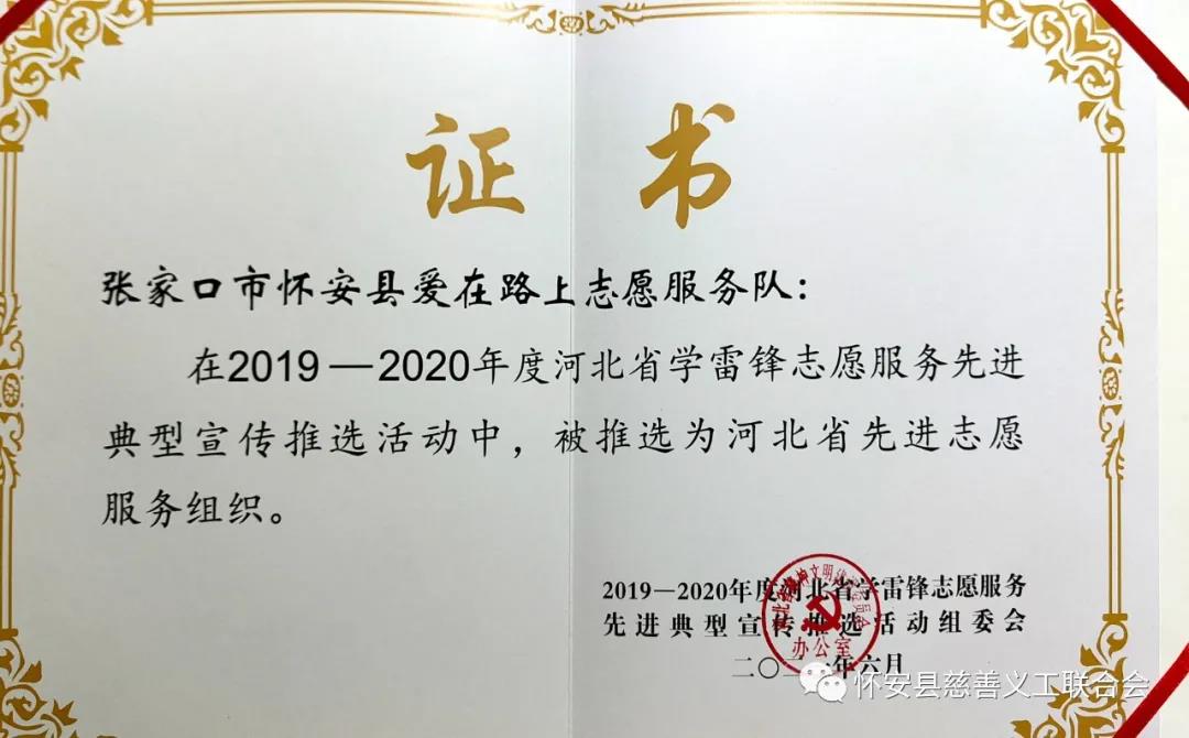在河北省省委宣传部、省委组织部、省文明办、省教育厅、省民政厅、省生态环境厅、省农业农村厅、省文化和旅游厅、省退役军人事务厅、省国资委、省扶贫办、省总工会、团省委、省妇联、省文联、省科协、省残联、省红十字会、省志愿服务联合会组织开展的“2019年——2020年度河北省学雷锋志愿服务先进典型宣传推选活动”中,怀安县慈善义工联合会爱在路上志愿者服务团队荣获两项奖励——“河北省先进志愿服务组织”,志愿服务项目“决胜脱贫攻坚文明实践进乡村“河北省志愿服务创新项目”