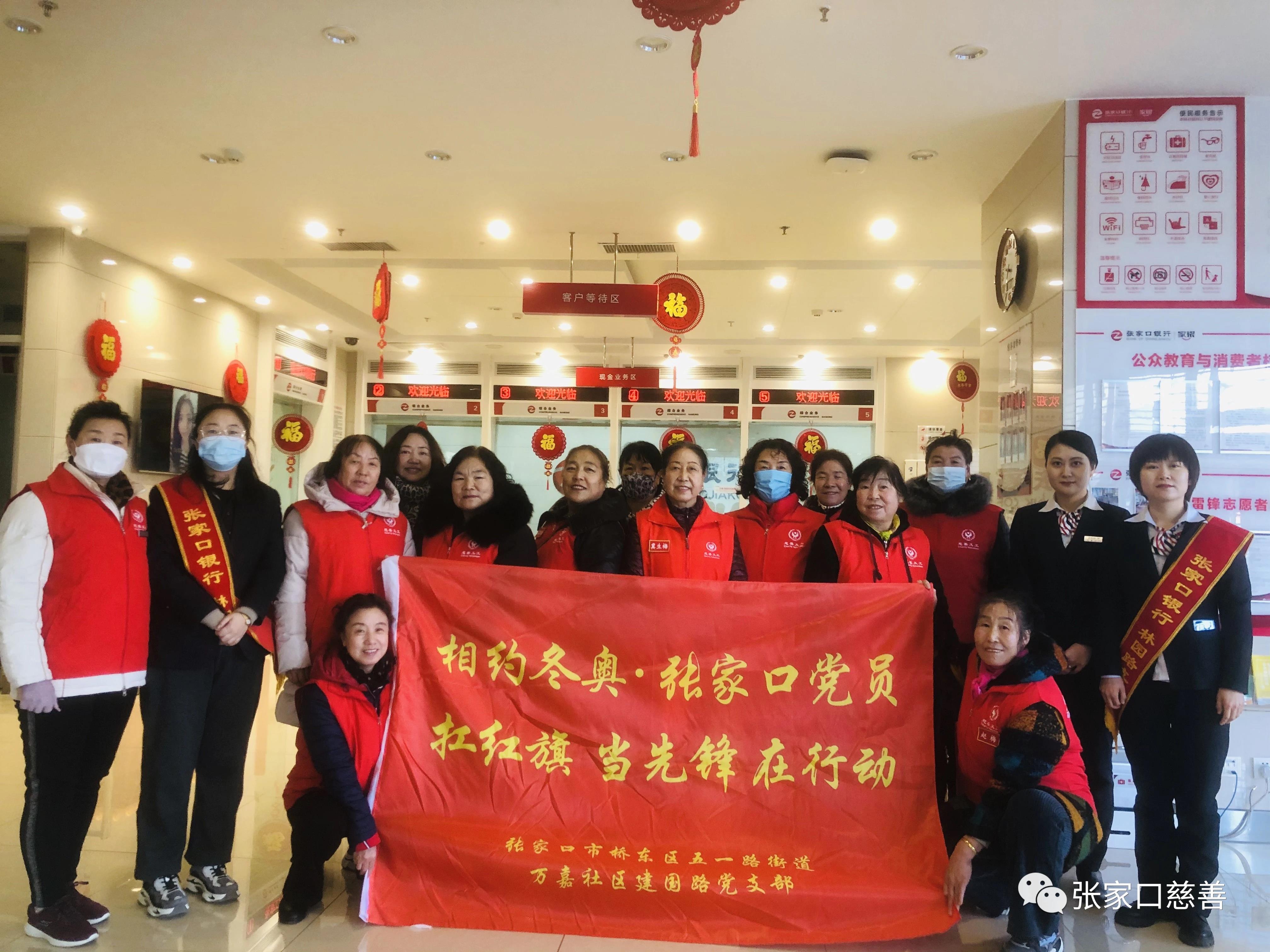 2021年12月22日上午九点,万嘉华庭舞蹈义工队队长冀生梅带领团队部分党员、入党积极分子及骨干参加万嘉社区与住街企业张家口银行林园路支行联合举办的“相约冬奥—扛红旗,当先锋”主题活动。