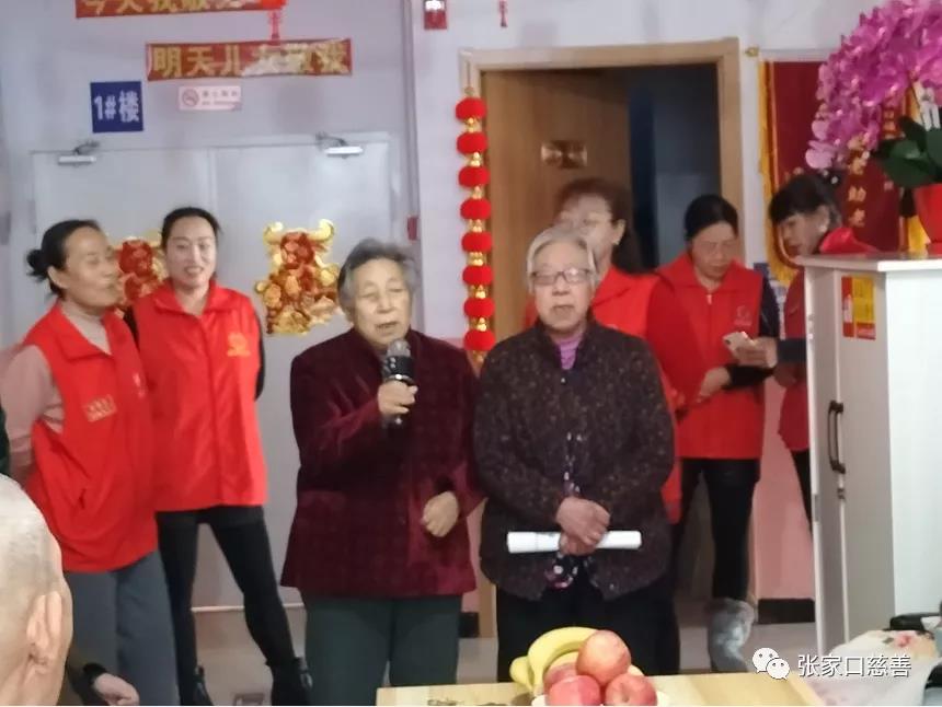 陈院长早早的就开始安排工作了,长长的桌子上摆着好多吃的,老人们围坐在四周,边吃边聊,喜庆元旦佳节。一切准备就绪,院长发言后联欢开始后,由我们志愿者表演《三句半》,锣鼓釵钵敲起来,四个人你一句我一句,句句是幽默风趣,逗得老人们哈哈大笑。接着老人们也不示弱,双人合唱,单人独唱,小品、幽默风趣的段子把我们大家都逗乐了,真是一群可爱的老顽童啊。联欢会最高潮的时刻到了,击鼓传苹果,鼓声停苹果落在谁手里谁表演节目,简直就像歌咏比赛一样,你唱《红梅赞》,我唱《没有共产党就没有新中国》,她唱《江山无限》,《万疆》手语舞、健身操舞,一曲接一曲,李生英老大姐还带来了一位爱心人士,为老人们理发,剪发。