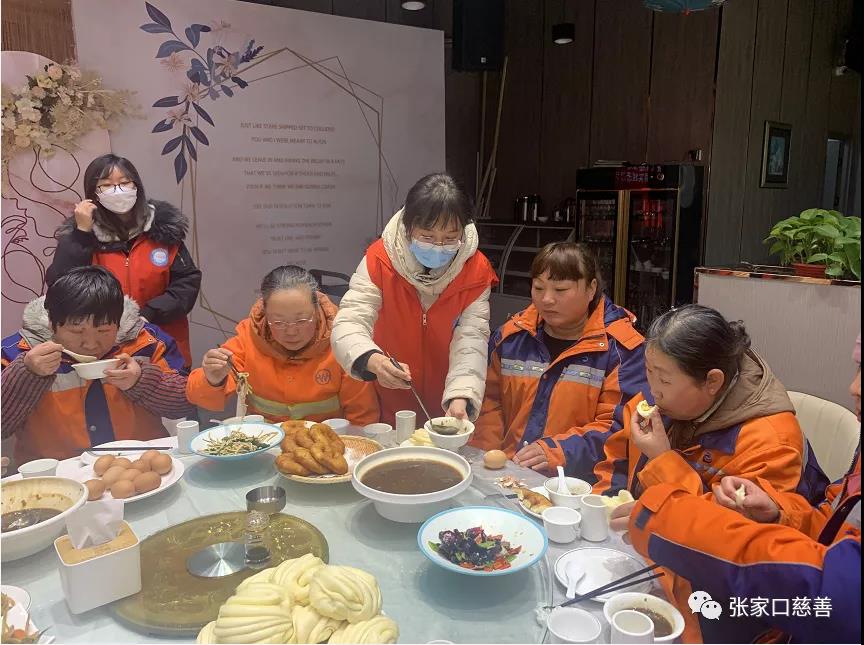 此次活动是由中华爱心粥全国组委会发起,张家口市桥西区文明办、共青团张家口桥西区委主办,张家口桥东区慈善义工联合会雷锋精神志愿者服务队,张家口小城故事餐饮有限公司,张家口金马利食品有限公司,张家口维榀早餐批发部协办。早上五点半志愿者们顶着夜幕,冒着严寒就来到了主会场桥西区小城故事饭店。大家齐动手把饭店厨师煮好的鸡蛋,热好的腊八粥以及面包分份包装,放到运送物资的车辆上面准备给正在执行清扫任务的环卫工送去。同时小城故事的王强总经理为到现场吃早点的环卫工师傅准备好了腊八粥、面包、鸡蛋、特色小菜、热气腾腾的花卷和现炸的油饼。时间来到早上七点,在忙完早上工作的20余名环卫工师傅陆陆续续来到了饭店。