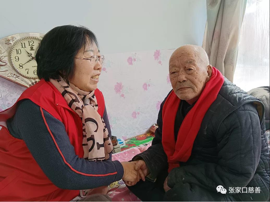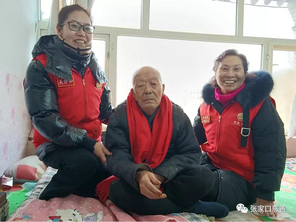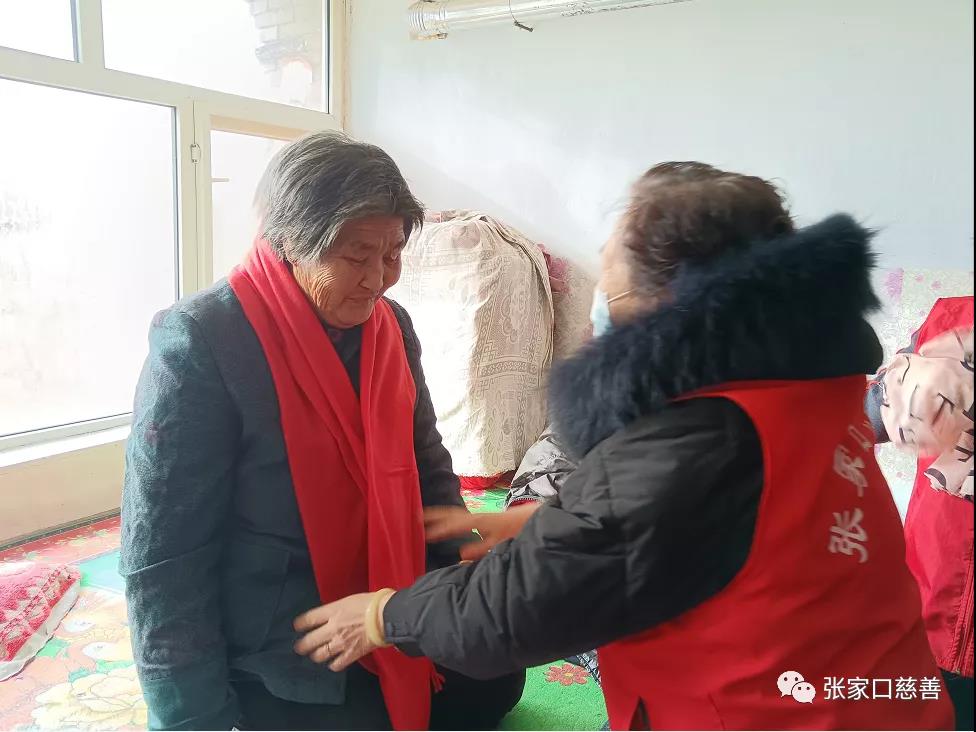 2022年1月12日上午,由负责助老工作的杜同会副队长领队,杜立梅、殷果花、吴静如、张春红5人。带着浓浓深情和物资踏上慰问行程。经过一个半小时的路程,到达宣化区深井镇胡沱店村温明祥家中。已进入耄耋之年温明祥老人今年94岁,曾经参加抗美援朝战争并屡立战功。家庭困难,今年身体日渐消瘦,经常躺在床上,不能久坐,看见送来的米、面、油、口罩、对联,激动得坐起来,像孩子一样高兴得望着大家,半天说不出话。给老人戴上红红火火的红围巾,老人更是兴奋得合不拢嘴。大家详细了解老人的家庭情况、生活状况,叮嘱他们在疫情防控期间做好防护、保重身体,度过一个欢乐祥和的新春佳节。善良朴实的一家人感动得不知说什么好,拉着大家的手不放,往小小的土炕拉,非要留下吃午饭,舍不得让大家离开,这就是最真挚的表达。大家婉言谢绝了,最后一家人依依不舍的把大家送到了大门外。
