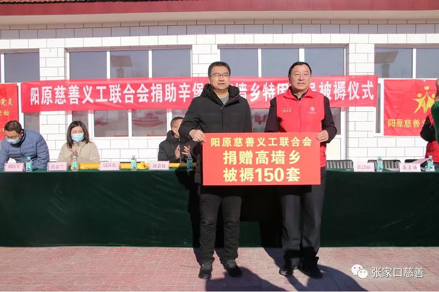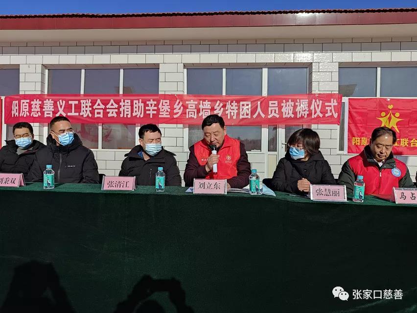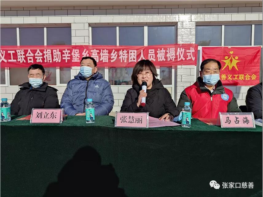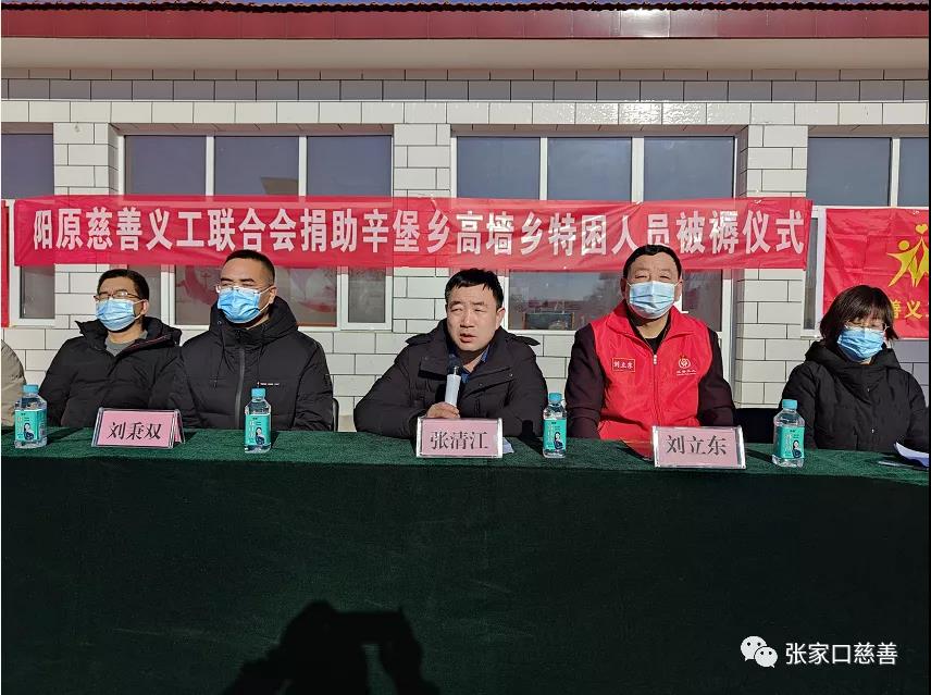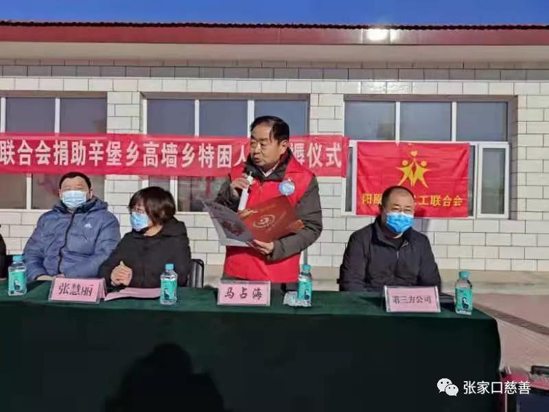捐助仪式由阳原慈善义工联合会文化顾问、敬老服务部负责人马占海主持!辛堡乡张雪青乡长首先致辞,她代表辛堡、高墙两乡感谢民政局、阳原慈善义工联合会、第三方公司对两乡的大力支持!表示一定积极配合第三方做好本项工作的落实。