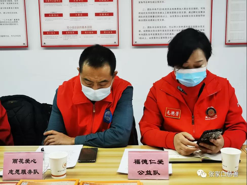 参加会议的有张家口慈善义工联合会党委副书记冀桂宝、执行秘书长赵小军、副秘书长孙小建,助老专业委员会会长李蓉萍,福德仁爱公益队队长毛艳芳,张家口国学研究会义工团队副队长陈明,长宁街炫美夕阳义工队队长王英,雨花爱心志愿服务队队长张源,京城广厦义工队副队长王钰艾,万全益民志愿者团队队长马晓和,赤城县慈善义工爱心团队张成立,会议由李蓉萍会长主持。市慈善义工联副秘书长孙小建就市慈善义工联本周的主要工作进行汇报,宣传部完成冬季期刊原图收集、会员部继续走访下届轮值团队、工作站对接社区落地公益大篷车项目接收整理物资等。