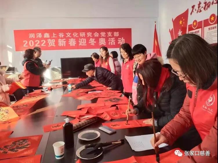 春节临近,满街红火, 1月18日上午,上谷文化研究会党支部在润泽鑫公司会议室举办贺新春迎冬奥写春联活动。著名书法家侯向阳、李天才、洪宝利和从张市特地赶来的书法家曹书文、史丽萍、上谷文化研究会会长顾建中、副会长战勇、党委书记任强、秘书长康富华和研究会会员、热心志愿者等30多人参加了活动。