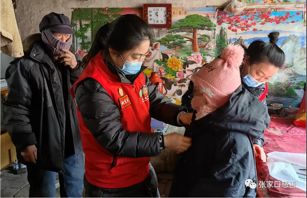 志愿者为李某笑同学穿爱心人士捐的新棉袄