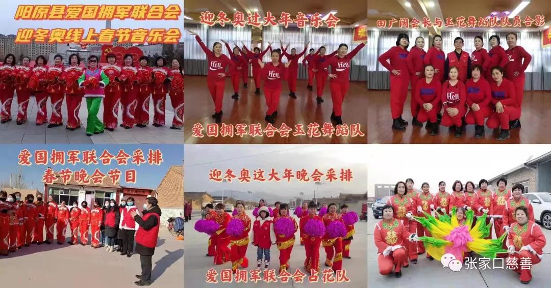 2022年1月30日,阳原县爱国拥军联合会举办线上春晚。晚会在给全国人民和阳原县人民大拜年的气氛中拉开序幕,首先由阳原县退役军人事务局副局长孙志伟、阳原慈善义工联合会会长刘立东分别致词,给阳原县人民、退伍军人、现役军人及家属拜年祝福。阳原县爱国拥军联合会会长致开幕词,大家是相亲相爱的一家人,走着走着2021年已接近尾声,2021年在成功和收获中度过,2022年以希望和奋进的激情向我们走来,在这辞旧迎新的日子里,在这温馨和谐的气氛中一起度过美好的时光,衷心的祝福却是永远相伴,在这欢乐祥和的日子里,让我们共同放飞梦想和希望,我们有理由相信,阳原县在新的一年里写下更辉煌的篇章,祝愿大家在新的一年里幸运会伴随着在座的每一位朋友,伴随着我们的每一天,衷心祝福所有朋友,生活奔小康,收入达富康,身体更健康,全家都安康,阳原县爱国拥军联合会所有志愿者祝全县的父老乡亲虎年大吉。