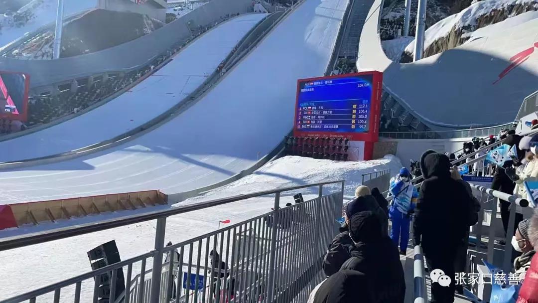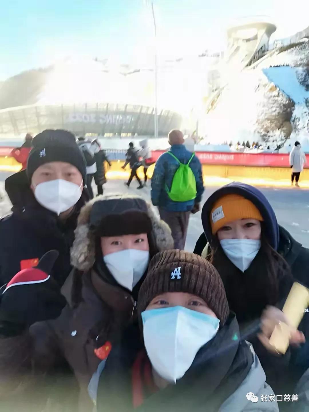 2022年2月5日,白鹭环保志愿者服务队志愿者杨彬彬、康亚丽、常子渊、吕伟按照自己所在单位要求,踊跃报名参加了2月5日14:20和2月5日18:45跳台滑雪两场比赛。从出发到返回大约需要9个多小时,他们忘记白天暖阳之下寒冷,虽然夜晚达到零下20℃度,也抵挡不住火热的心情,一手挥动五环旗帜,一手挥动着冰墩墩、雪容融“相约冬奥 激情绽放”为运动健儿呐喊助威,是祝福也是梦想。
