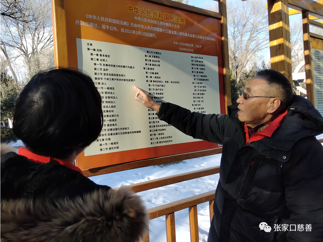 老党员,退役军人志愿者李书庭用自己担任爱国主义教育辅导员的经历,讲述着自己学习《宪法》、《民法典》的有关内容,做一个知法懂法的志愿者,做一个有爱心多奉献的志愿者,用志愿者的身份践行社会主义核心价值观,让更多人了解国家的法律法规,让更多人知法懂法,让更多人参与到志愿者的行列中,为社会增添正能量,为建立和谐社会,促进张家口城市的文明建设添砖加瓦。