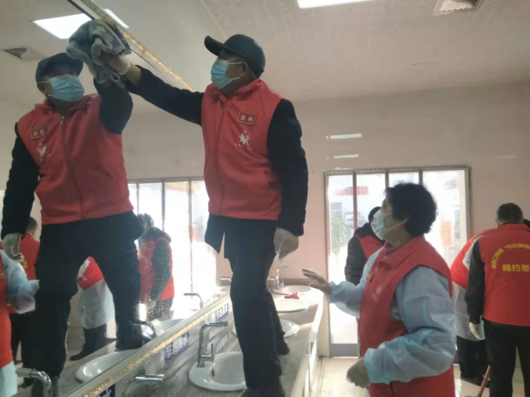 一大早老党员鲍玉珂、梁成山就来到车站值勤,紧接着支部书记贾宪、队长马占海、党员关键也到了,随后入党积极分子王秀兰、张秀兰,老党员刘桂花、张林、杨直云等十人很快都到齐了。党支部书记贾宪布置工作,留下两名志愿者配合疫情防控工作,其他志愿者全部去清扫厕所。各位党员志愿者们都积极行动起来,党员关键取出带来的清洁剂,党员马占海拿来了家用小喷壶,入党积极分子王秀兰给大家分发自己带来的一次性手套,大家投入到了紧张的工作中。老党员贾宪、马占海、张林擦拭高处,关键、王秀兰、张秀兰擦低处。很快洗手厅的墙壁、台面、镜子、洗手池等都擦拭干净了,老党员鲍玉珂、梁成山两位离体老干部墩地,马占海、关键又开始清理残疾人专用厕所。同时大家两人一组,男志愿者负责打扫男厕所,女志愿者负责打扫女厕所。墙壁、地面、便池每一处大家都清理的十分仔细。每个卫生死角大家都不放过。正当大家干的热火朝天的时候,阳原县慈善义工联合会刘立东会长等一行四人来看望大家,并立即加入到了我们的队伍中,和大家一起打扫起来。经过两个多小时的努力,大家终于把每个便池周围那些难擦的污垢也都一点点清理干净了。难闻的气味消失了,厕所终于被大家打扫的干干净净了。这时,车站的刘经理来了,刘经理非常感动。他说:你们不但尽职尽责的完成了执勤工作,还帮助我们清扫了厕所,真是帮了我们大忙,谢谢大家你的了,车站里响起了热烈的掌声。