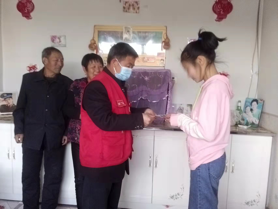 发放中有一位小学生叫郝某霞,今年13岁,在阳原县某乡中心校读书,该生年幼失去父母,和她叔叔一起生活,叔叔身体不好,加上这几天患重感冒,不能领孩子去阳原联合会领取助学金。阳原县爱国拥军联合会田广阔会长得知此消息,就主动向联合会副秘书长、河慈联阳原工作站专职翟秀霞申请,愿意为郝某霞送助学金,翟秀霞副秘长很高兴的说,大好了,那就辛苦田会长了。