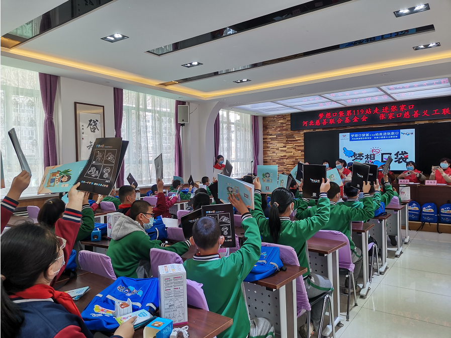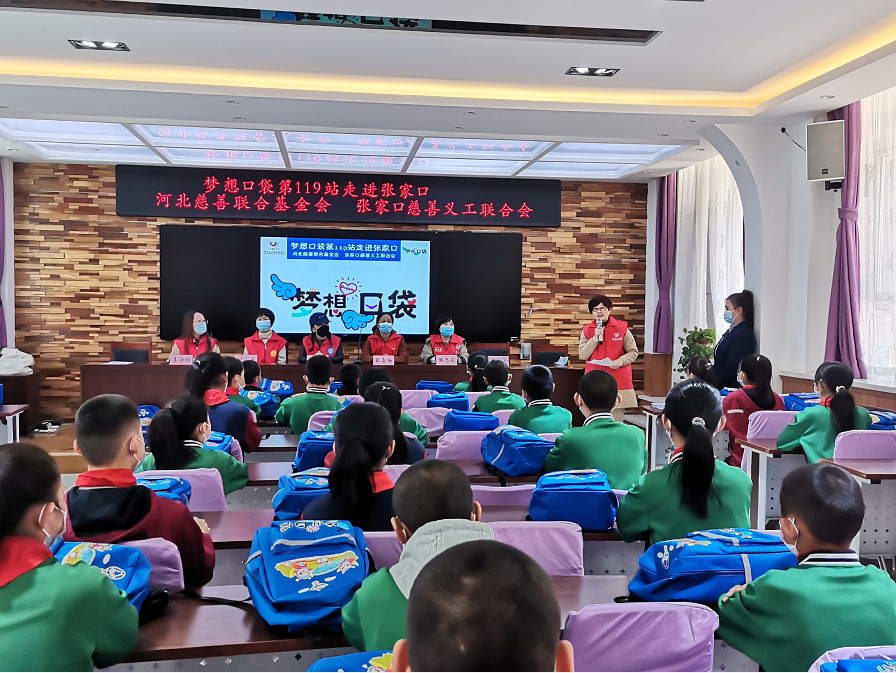2022年4月8日上午,白鹭环保志愿者服务队联合张家口市生态环境局桥西区分局、张家口慈善义工联合会双工发展专委会、张垣博爱社会工作服务中心,带着河北慈善联合基金会、张家口慈善义工联合会的爱心人士们捐赠的48个“梦想口袋”走进大境门小学,捐赠对象为困境家庭学生。在这个充满关爱和温情的氛围中,大境门小学隆重举行了“梦想口袋第119站走进张家口”主题捐赠活动。