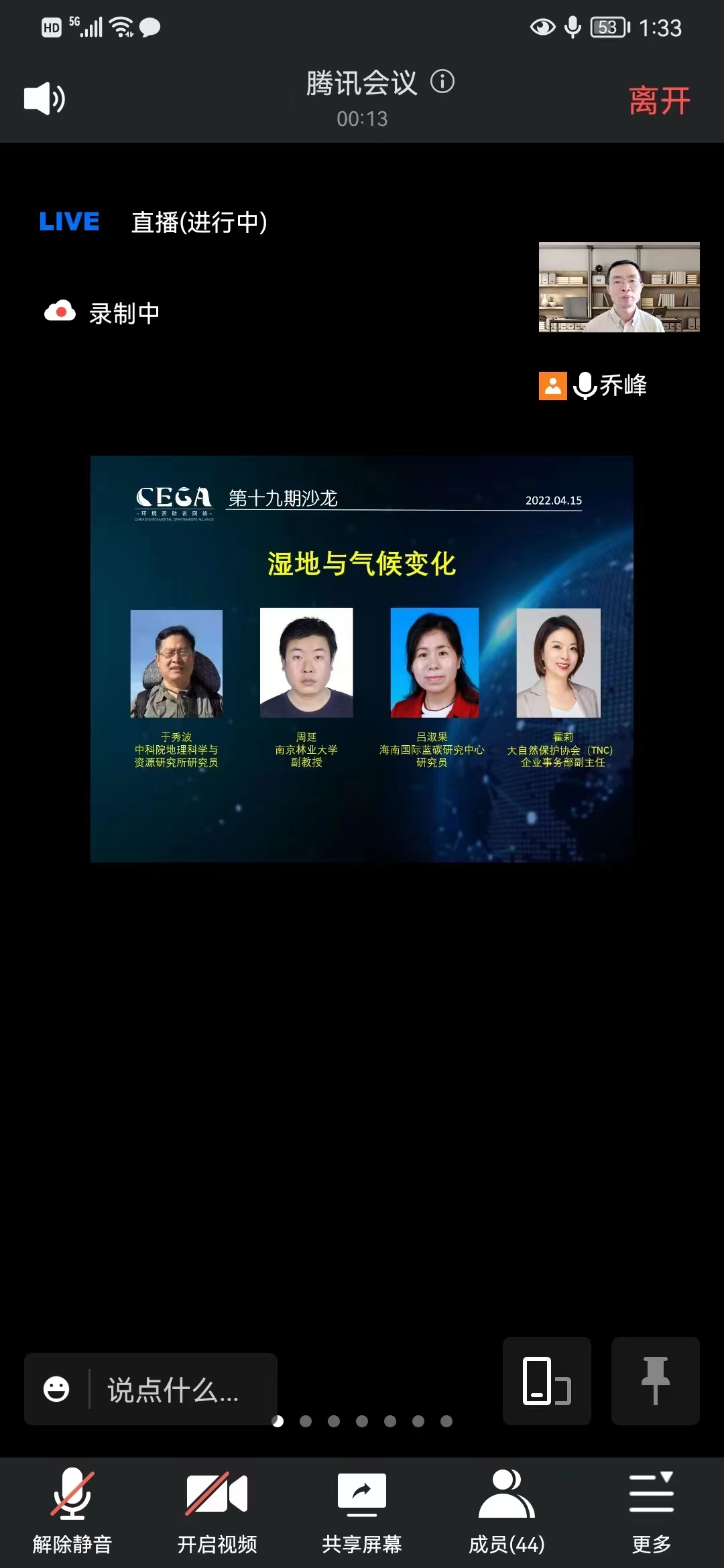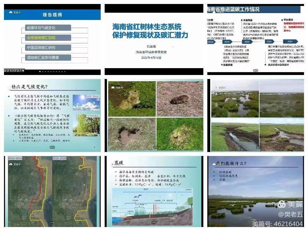 2022年4月15日下午,白鹭环保志愿者服务队40人参加了由中科院地理科学与资源研究所于秀波研究员、南京林业大学周延副教授、海南国际蓝碳研究中心吕淑果研究员、大自然保护协会(TNC)企业事务部霍莉副主任四位大咖老师分享“湿地与气候变化—CEGA第十九次沙龙”。深层次的了解了“碳循环与气候变化”、“全球湿地碳汇功能”、“中国湿地碳汇研究”、“碳汇湿地监测与展望”、“海南省红树林保护修复现状及碳灰潜能”、“海南省推进蓝碳工作情况”以及“什么是气候变化”,用清晰的画面,通俗易懂的示意图,修复前后的对比图,用不同的线条勾画出在气候变化的影响下,中国对推进“蓝碳”的治理能力与坚定不移信念。紧跟新时代生态文明教育理念,用专业的技术组建专业的团队,大力推进公众参与的积极性与主动性。