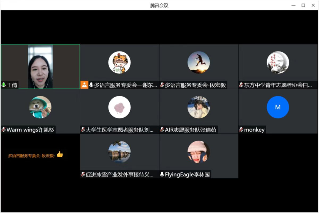 首先由王倩会长向与会成员传达了理事会会议精神和专委会换届情况,接着与会成员进行了简单自我介绍,新任秘书长冀鲁豫也进行了言简意赅的发言。接下来是执行秘书长谢东财向与会人员汇报了第一届专委会的工作总结以及各队伍负责人汇报本队伍工作总结。然后大家讨论了多语言服务专委会的发展前景与规划,期间王倩会长特意提到要发挥外语特色,以英语为主其他语种为辅,努力做好志愿服务工作,在后冬奥时代再接再厉,共创新辉煌。最后由段宏毅副会长做会议总结。