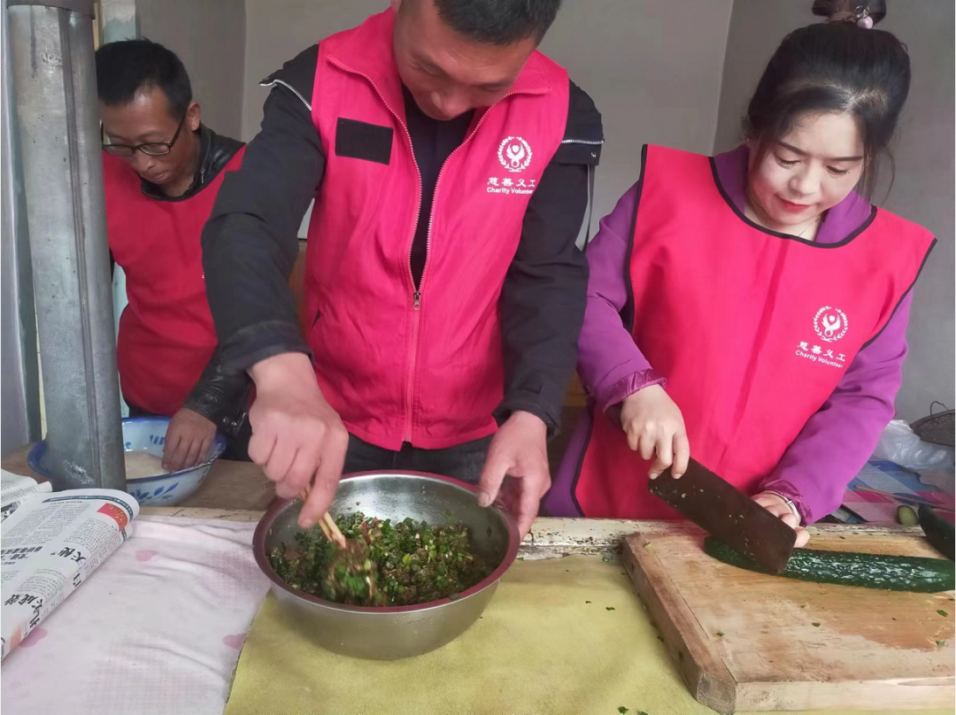 徐奶奶热情好客,嘘寒问暖后,志愿者们说,说干就干,洗菜的,剁馅儿,揉面,擀皮儿的,忙的不亦乐乎,场面温馨有温度,边包饺子边和徐奶奶亲切交谈,详细了解了老人的生活状况,老奶奶今年81高龄.老伴走了十多年了,一边和徐奶奶拉着家常一边志愿者们分工有序,配合默契,不一会就包了好几盖帘,爱心饺子送到了老人的心坎上,饺子孕育着亲情,饱含着关爱,一个个外形饱满,暖胃又暖心得饺子包好了,看着志愿者们煮好的饺子,老人脸上笑开了花儿,连声道谢!