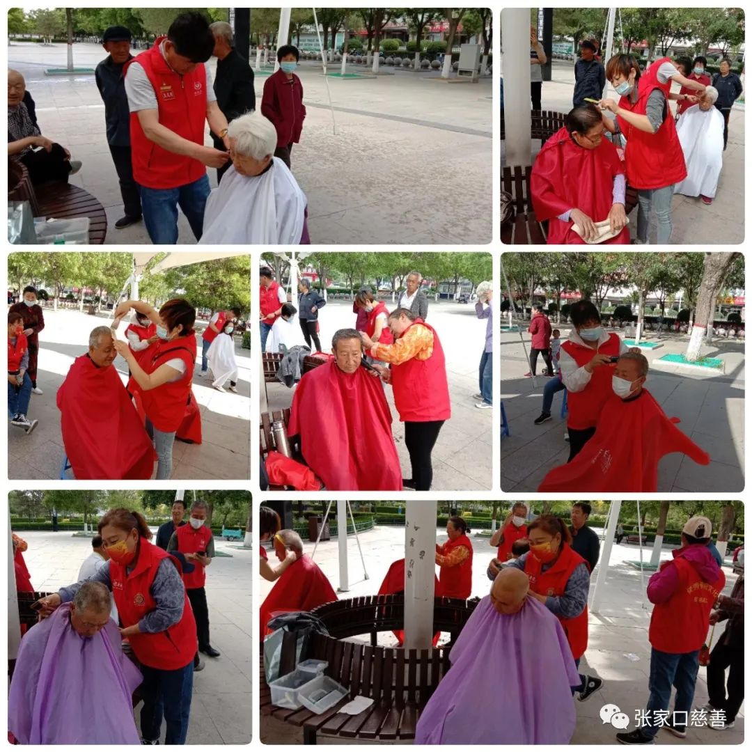 5月26日星期四,下午三点,阳慈联雷锋理发队的志愿者们再一次来到泥河湾文化广场便民理发。