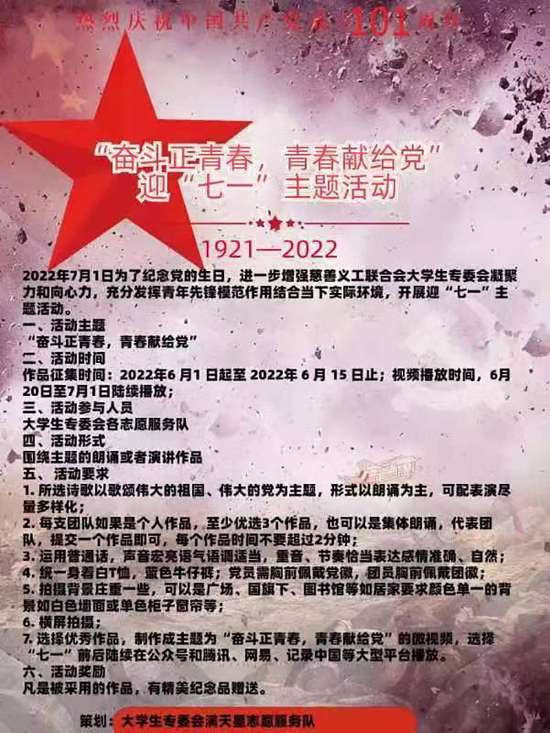 大学生专委会各志愿服务队将团队选送的作品(非原创作品请标明出处及作者)发送至marilyn620-2008@163.com, 作品提交截止时间2022年6月15日。