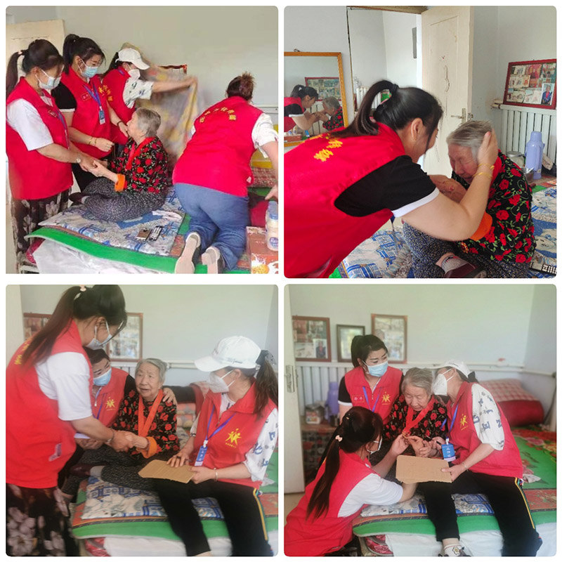 老人1956年入党,曾长时间的担任村里妇联主任、治保主任,曾在省里受过表彰。五几年去县里开会都要背着行礼,没有交通工具,全凭两只脚,还要赤着脚过河,冬天也是如此,所以在年轻时候落下了腿疼的毛病,导致很早腿疼下不了床。老人很风趣,说起话来滔滔不绝,声音也很宏亮,就是耳朵失聪,想问什么骨干张艳青就写在纸上,老人聊的非常愉悦和开心,握着助理孙平手久久不肯放开。骨干刘晓英、赵国清、贺树梅等轮流着与老人交心,并为老人梳头、整理床,老人感动的流下了眼泪,大家嘱咐老人多注意身体,按时吃药。