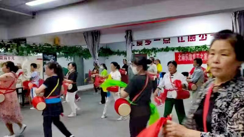 腰鼓是汉族传统棰击膜鸣乐器之一,它来源于生活,又很好地表现了生活。历史悠久,发音脆亮,在民间广泛被流传。北师乐缘义工之家为了丰富队员们的业文化余生活,由薛彩云和窦喜荣队长组织牵头,北师乐缘腰鼓舞队正式成立,共计45人,平均年龄60岁,因受疫情影响从筹办到成立用了近俩个月的时间。