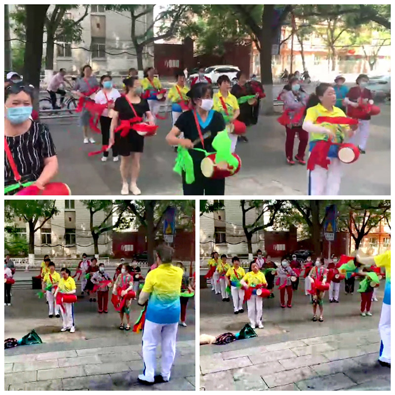 6月18日下午两点半,30名队员们冒着酷暑来到尚峰广场进行强化训练,窦喜荣队长指导大家按照录制时间,强调个人动作规范到位,集体动作统一整齐,并对基本动作要领的“马步”做了重点训练,队员们在烈日下不怕辛苦努力认真地一遍一遍的练习直至掌握要领。腰鼓捶的红绸子时起时落,随风飘扬,铿锵的鼓点,击出了北师乐缘人昂扬的风貌,坚定的信念。我们充满朝气的训练得到了许多路人的肯定,有些人现场加入北师乐缘。