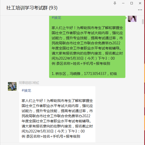 为积极响应当地防疫政策、做好考生的报考咨询工作,张家口慈善义工联合会双工发展专委会建立社工培训学习考试群。同时,为切实帮助广大考生了解报考条件及信息填报要求,提高报名效率,通过线上分享的方式详细讲解了考试报名的流程和注意事项,规范报名流程。
