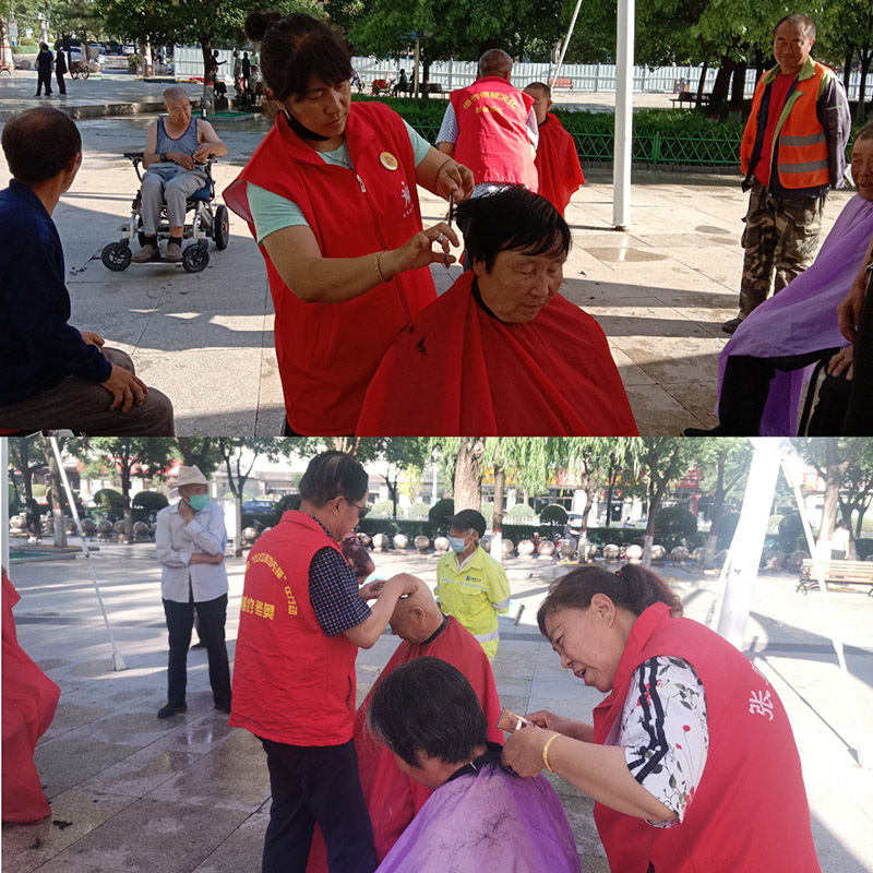 下午3点,刘忠、王利军、春风送暖队张秀荣3人来到广场,王利军开始为一位老人理了发,刚理完倾盆大雨倾泻而下,大家进了警务室避雨,有的志愿者在群里说明了情况因为下雨没能准时到来。过了一会儿雨停了大家又开始忙着为乡亲们服务,张秀荣、王利军为乡亲们理发的同时,志愿者薛艳花和杨航龙参加到队伍中,刘忠往日专业摄像,今天也拿起理发工具开始理发,杨航龙为大家拍照摄像。