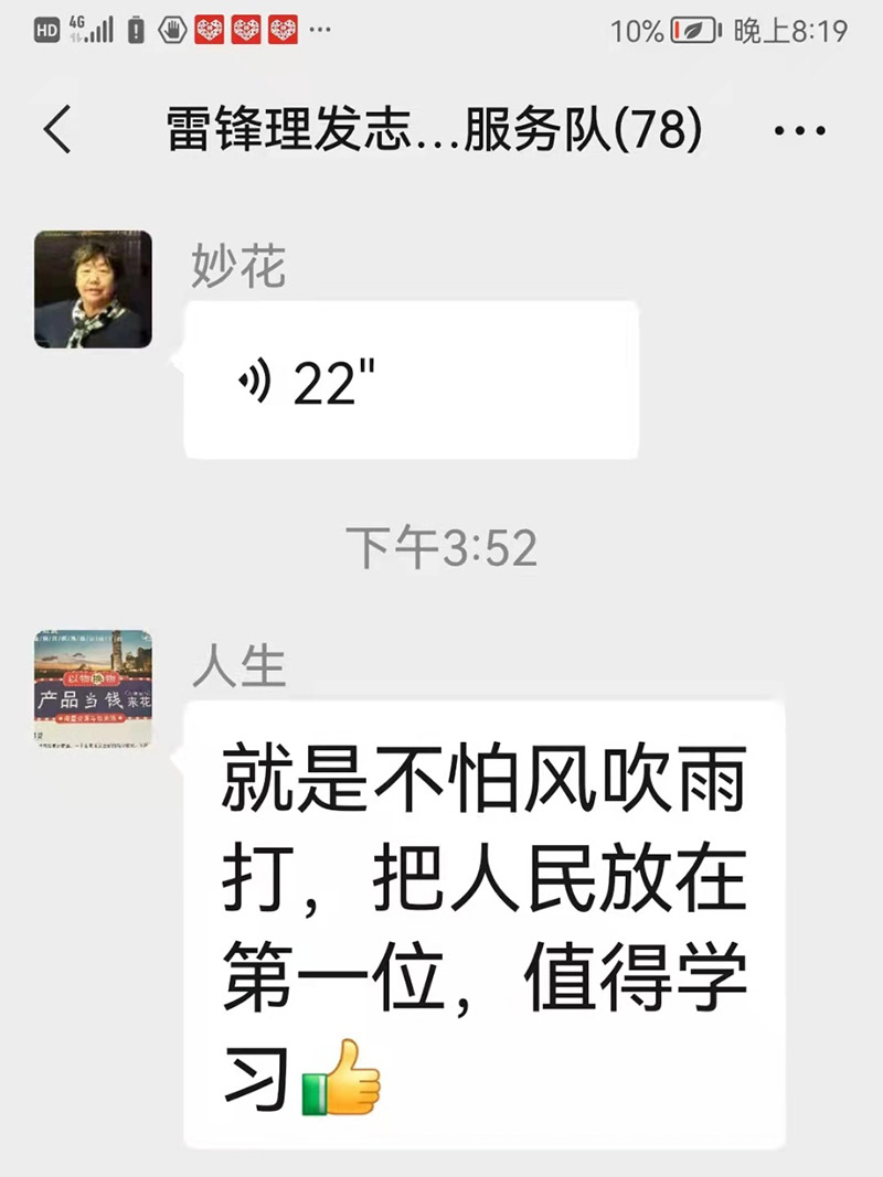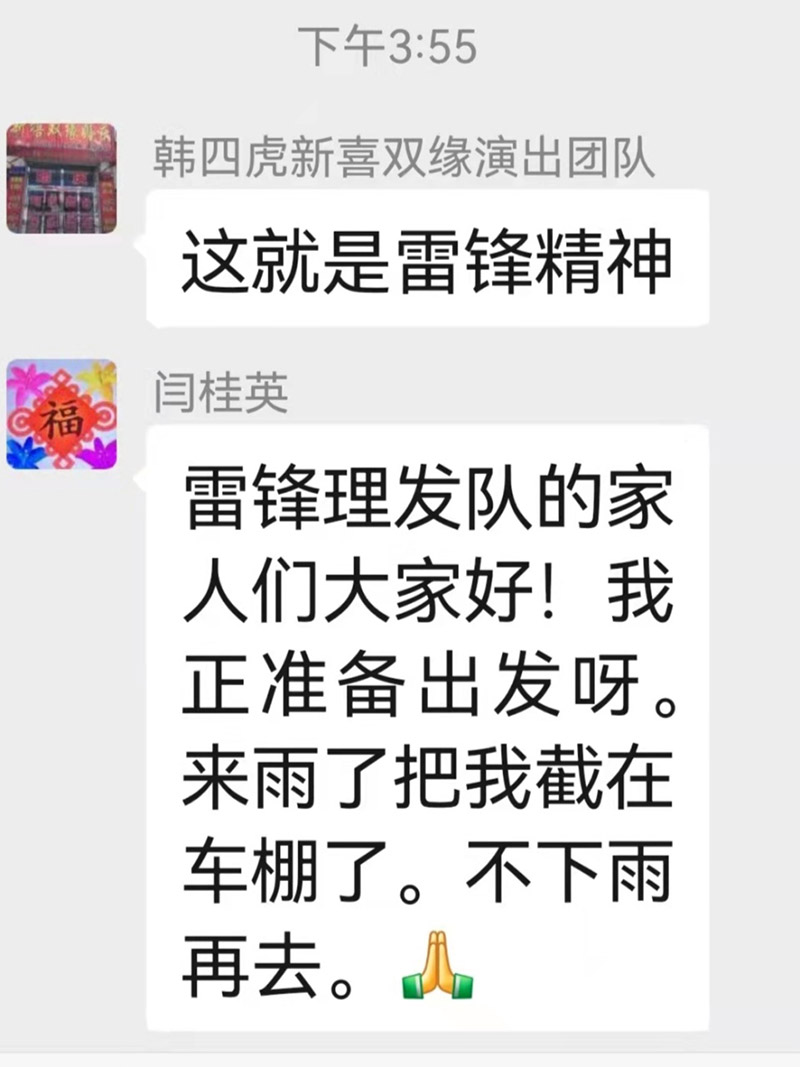 本打算雨后来理发的人不会多,和没来的志愿者在群里说不要来了,没想到来理发的人越来越多,把几位志愿者忙的汗流浃背,大家热火朝天地一直理到傍晚6点多,来理发的人才少了,下午这几位志愿者共服务了30位乡亲们,由杨航龙为我们和一位理好的老人拍了合影。因下雨未赶到的志愿者在群里发来了鼓励!