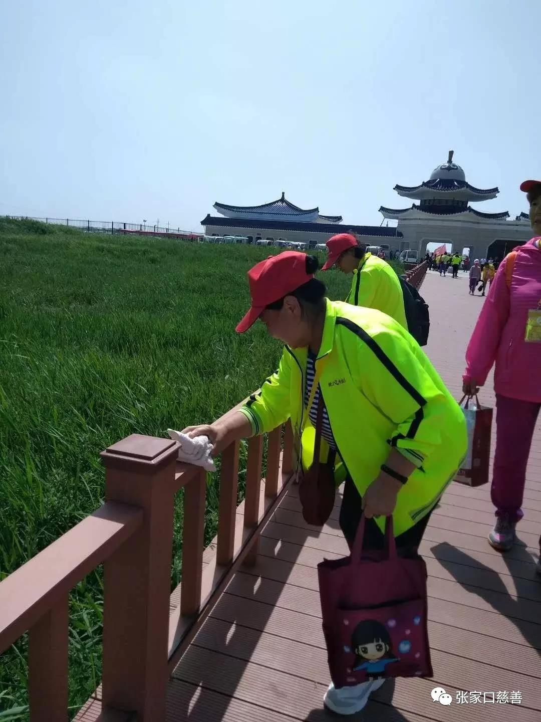 上午草原的天空纯净明亮,草地辽阔壮丽,爱心黄丝带义工之家之郭卫兵总队长做了简短的讲话,并分配了各小分队工作任务,老师们分头开始行动起来。各个分队队长青青草舞蹈义工分队长 路玉兰、合唱团分队长 季建忠、贾秋萍团长威风锣鼓分队 黄御淇、胜利公园分队长 杨金梅、百花分队长 杨文秀等、参加公益老师近百人。各队不同分工区域、擦观光车,老师们非常认真仔细的擦试着每部观光车,车窗擦的干净明亮;其它队老师在草丛里拾捡拉圾,树叶,废纸等杂务收拾的干净整洁,路边小亭子里培训部的老师们正在忙着擦试供游人休息的环形条椅,以及柱管栏杆等,在活动中的各个角落都能看见身穿红马甲或穿黄色队服的志愿者老师们忙的不亦乐乎,毫无怨言的不计报酬,不斤斤计较的,把自己的工作干好,看到工作人员以及观众满意的笑容很是值得,那种自豪感,快乐感却是从心底油然而生。
