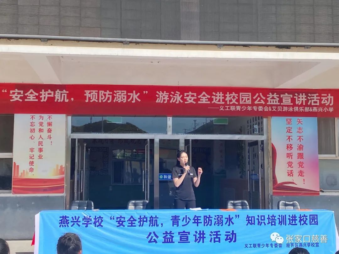 每年5月至9月是学生溺水事故高发期。生命只有一次,—次的疏忽就可能造成难以挽回的伤害,给家庭带来难以弥合的伤痛。现在正值天气转热时期,—些学生会禁不住酷热而偷偷瞒着老师和家长下水游泳,这是极其危险的。为确保学生生命安全,严防因游泳、嬉水、恶劣天气带来安全事故的发生。2022年7月15日市慈善义工联合会青少年发展专委会联合艾贝游泳俱乐部来到了经开区燕兴小学开展“安全护航,预防溺水”游泳安全进校园公益宣讲活动。