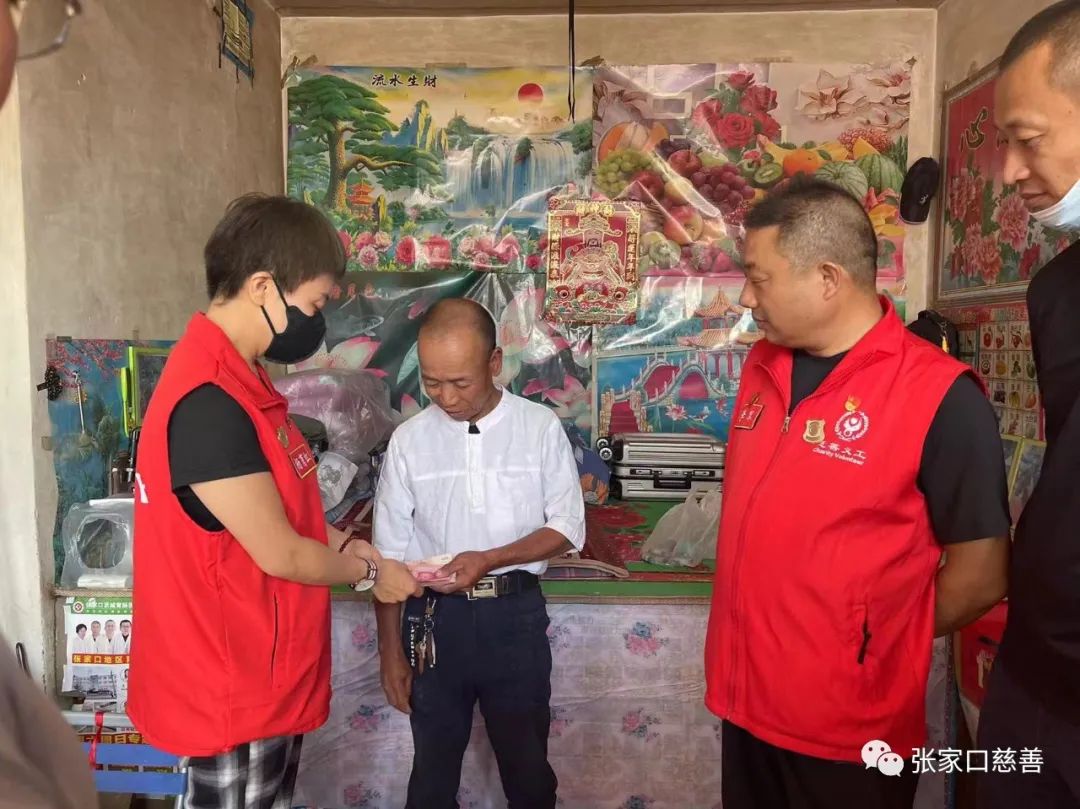 7月23日上午“同心携手、为爱传递”义工队由会长李军、秘书长杨育红带领十余名爱心人士前往尚义县小蒜沟镇为安启明送去慰问金陆仟元,义工队宣传部关医生在现场还仔细的查看了老安的各种医院检查结果,告诉他“你的病是能治好的”,这也给与了被资助人莫大的精神支持。