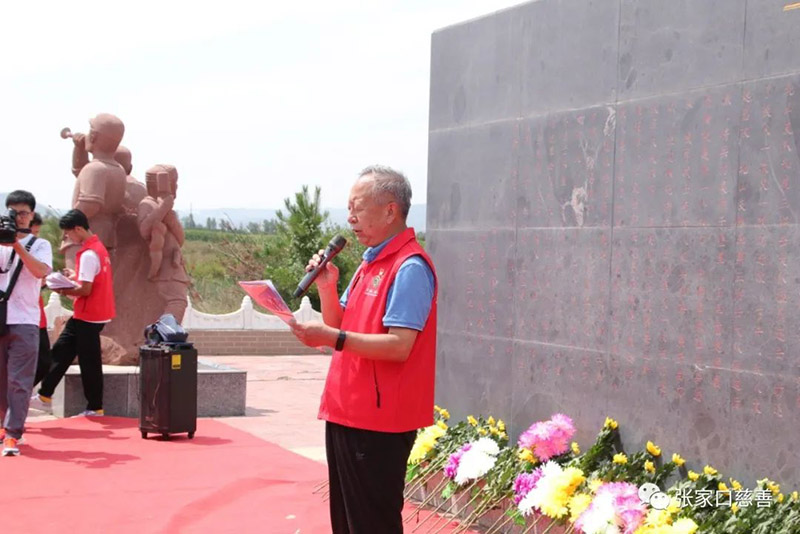 张家口慈善义工联合会党委副书记冀桂宝代表与会领导讲话,他说:“今天的活动举办的非常有意义,我们聆听了战斗故事,缅怀了革命先烈,更加坚定了理想信念。让我们更加紧密地团结在以总书记为核心的党中央周围,牢记使命,奋力前行,为建设更加强大的祖国作出新的更大的贡献!