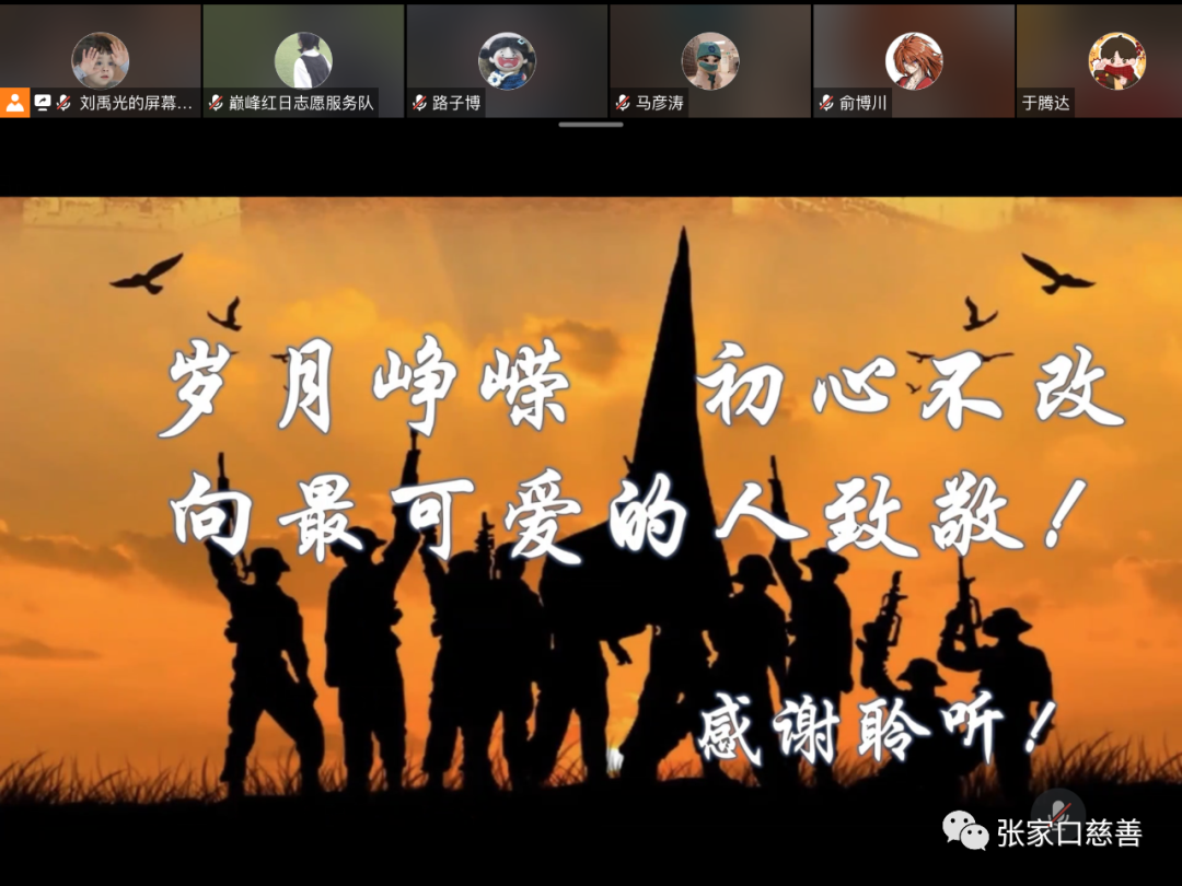 “迎八一?颂党恩”建军节主题宣讲活动于7月31日下午4时通过腾讯会议举行,本次主题宣讲会共包括三部分内容:讲述建军节历史由来、国防安全教育和致敬人民解放军。通过聆听宣讲人对于建军节有关历史的讲述,志愿者们深切感受到人民子弟兵英勇无畏的英雄气概;第二部分内容由人民军队的不断强大延伸到国家安全,阐述了中国人民解放军的职能逐渐从武装斗争向捍卫国家主权、安全转变。最后,与会的志愿者向现役及退役军人致敬,衷心表达对全体军人的节日祝福,讴歌人民解放军使命在肩、初心不改的热血军魂。