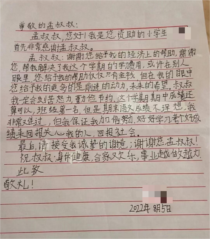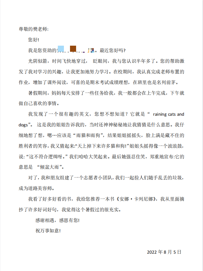 孩子们在信中表达对资助人的谢意及祝福,还附有一些孩子们现在的照片,以书信的方式让资助人看到自己没有辜负爱心人士的资助和鼓励,这一封封书信承载着孩子们对资助人深深的谢意,也是对资助人爱心付出的反馈。
