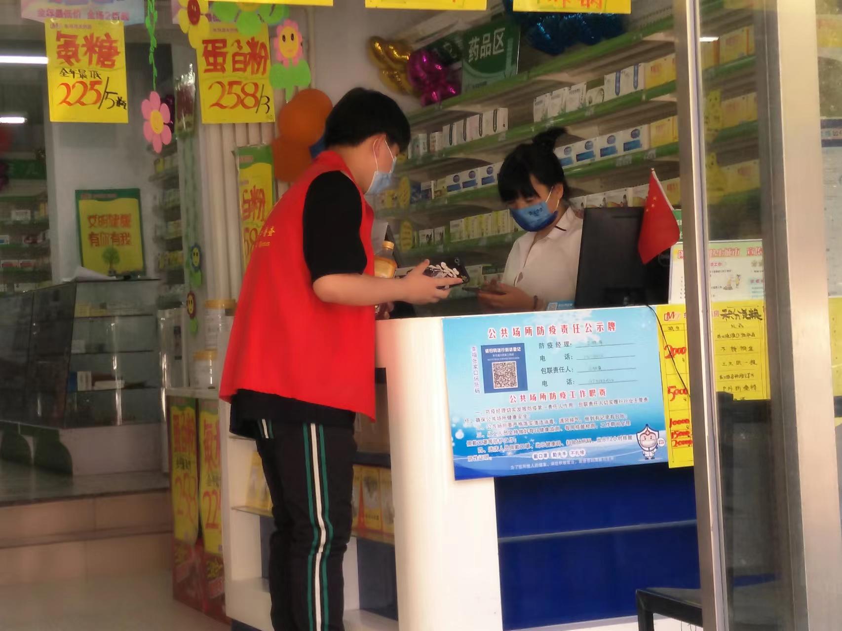 志愿者堵智超在药店检查防疫情况