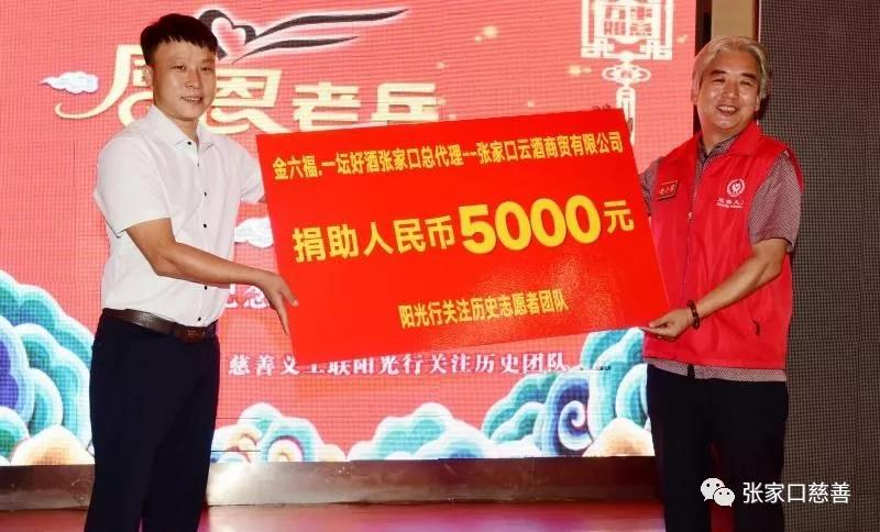 联欢会现场,爱心企业家,金六福酒业张家口总代理李君良,是东北辽宁人,从小就听老人们讲述东三省白山黑水十四年艰苦卓绝的抗战故事,慰问功勋老兵的活动深深的感动了这位年轻的CEO,李总现场为团队捐赠人民币5000元,用于日后慰问功勋老兵物品的采购费用,并表示将赞助以后慰问活动的所有慰问品,同时,每卖出一瓶一坛好酒,就再捐出一元钱作为团队活动经费。此举也感动了在场的所有人,义工联的夏栩飞副会长,也是一名爱心企业家,为对爱心企业家李君良的支持,当场购买了一万元的酒品,感谢金六福酒业企业家对公益事业的慷慨捐助。与会的网易新闻、义工之声、长城网、好人中国网、北京晚报等多家媒体将对此次活动予以报道,大家将携手共进,将慰问功勋老兵公益活动传承!传递!弘扬!将公益之花绽放,在公益之路同行!联欢会特别邀请的4位功勋老兵代表与大家欢聚一堂,共庆建军91周年。联欢活动在欢乐、祥和的文艺演出中结束。(通讯员:安咏梅,审核人:赵小军