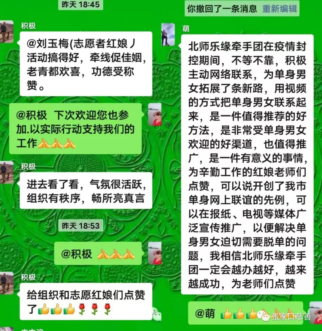牵手队这次能够成功的召开”微信群聊线上见面会”得到了许多人和各个方面的大力支持,才得以成功举办。非常感谢所有热心帮助和支持这次活动的老师们。此次活动后,许多人在微信群里留言,有位网友写诗称赞:活动搞得好,牵线促佳姻,老青都欢喜,功德受称赞。还有一位中老年朋友说:牵手队开创了我市单身网上联谊的先例,建议在报纸,电视上广泛宣传推广,为老师们点赞。北师乐缘牵手队将总结经验更加努力,为解决单身男女的迫切问题,解决当今社会的刚需问题,努力创新,开拓进取。撰稿:刘玉梅摄影:马德生审核:陶京峰来源:北师乐缘义工之家