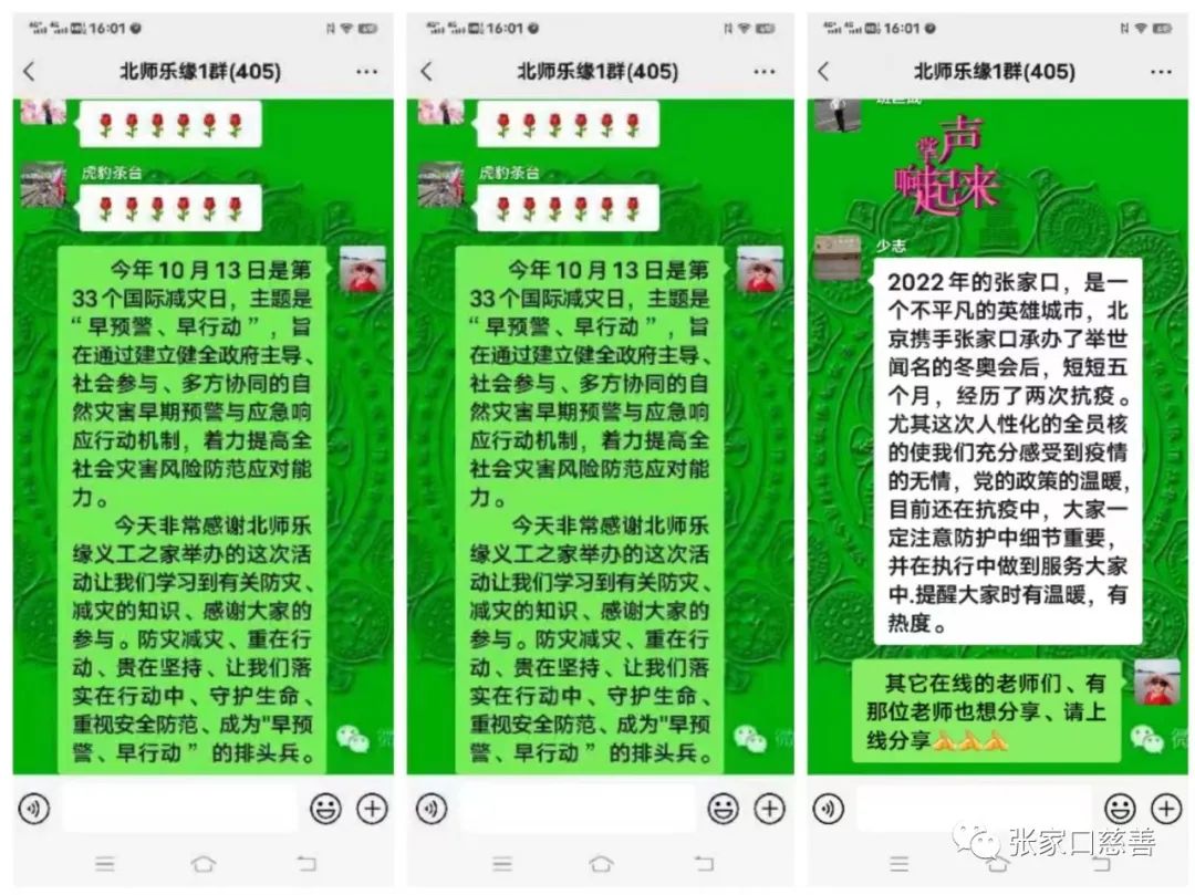 13日下午三点,在北师乐缘近四百人的工作群里,防灾救灾知识学习和心得分享活动准时开始。刘玉梅老师主持,吴浩然队长讲话:自然灾害是当今世界面临的重大问题之一,严重影响社会经济的可持续发展以及威胁人类的生存,北师乐缘团队积极响应市联合会倡议,呼吁防灾减灾、人人有责,全民参与共筑平安,从我做起守卫生命与家园,在"国际减灾日"的今天,组织学习防灾减灾常识,增强防灾诚灾意识,提高避险自救的技能,有效的保护自己和家人的安全,愿我们防灾求得平安在,减灾换得幸福来。老兵队副队长庞润平介绍了“国际减灾日”的由来及主题,每年10月13日举行的"国际减灾日″纪念活动,旨在赞赏全世界民众和社区为减少遭受灾害风险做出的努力,并提高他们对所面临风险的重要性的认识。并讲了火灾防控,要坚持人防、物防、技防相结合,详细介绍了人防、物防、技防的要求及知识要点。重点强调:加强人防管理体糸建设,树立全员动手综合治理的大安全意识,把安全责任落实在每个人,形成人人有责、处处保安全的人防体糸。