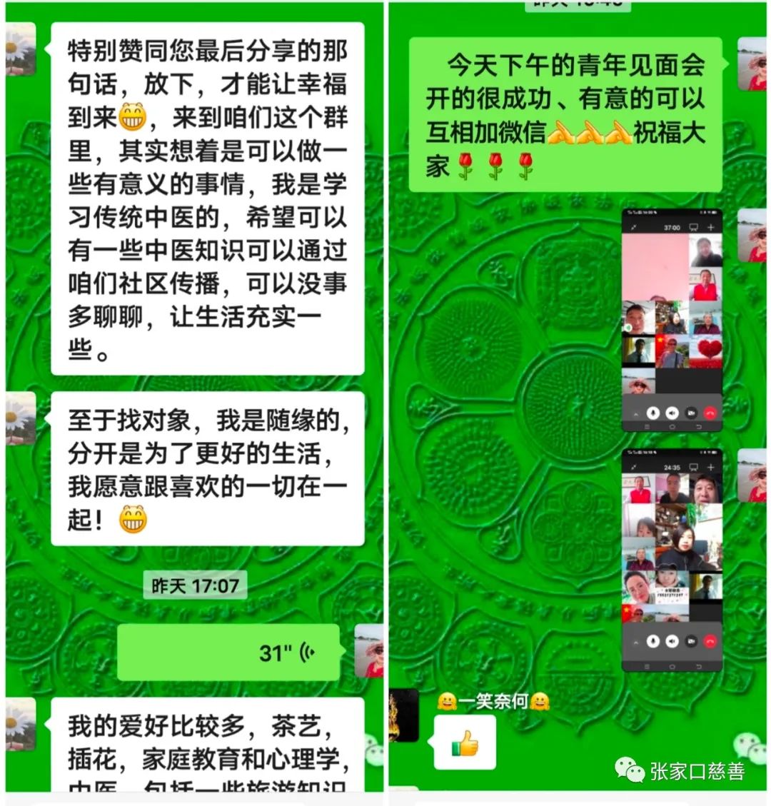 下午4点刚刚开始,大家就聚在微信视频会议室内,首先男青年们逐个自我介绍个人的情况,尤其有两位年轻人在疫情期间一直在社区做志愿者,两人骑着电车为社区驮运各类物资并为社区服务尽心尽力的努力工作,成为单身群里的模范榜样,他们这次抽空也来参加线上见面会,让大家非常佩服他们的志愿者精神。还有几位阳光的男孩儿们的介绍引起了在场女青年们的关注。