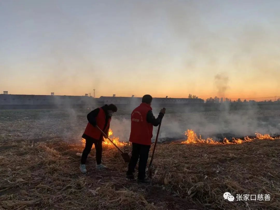 2022年10月17日,春风助残义工队的志愿者们由副队长郭正江带队,和近期张家口疫情防控以来,他们和往常一样守护在张家口南环卡口,紧张有序的进行一线疫情防控,耐心,认真的检查着每一辆过往车辆,到了下午5点左右大家精疲力尽正想歇歇时,志愿者王飞对郭正江说,远处好像是有烟雾,副队长说你去看看去,没等王飞走多远就听着王飞喊,前面庄稼地里着火了,快点过来救火吧,郭正江远远望去一股黑烟看似火势挺大,边说边招呼队友就近找个铁锹往火势那边跑,原来是路边玉米田地的秸秆着火了。