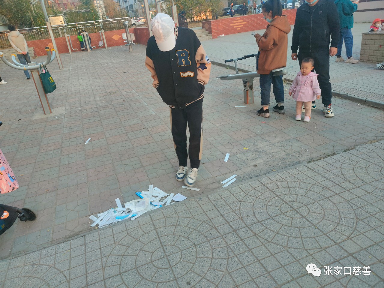 2022年10月19日,已经是张家口桥东区全员核酸的第十六天。下午五点左右,林园路龙腾花园二期的广场上,有一些下了网课的孩子,和零零星星的路人。虽然全区正在逐步恢复封控,但大人们依旧忧心忡忡。只有少年不知愁滋味,尽情享受着难得的空闲时光。只有一个孩子例外,他是张家口第七中学初一学生樊嘉硕。他看着被风吹了一地的核酸检测试剂包装袋若有所思。一开始,他选择默默地用脚把它们聚集到一处,可怕的病毒让年少的他畏惧。可是想“抗击疫情,净化环境”的心情更强烈,他终于还是选择俯下身子