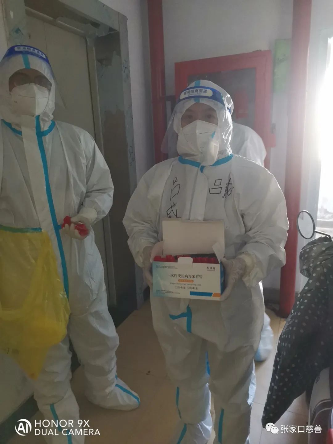 转送生活物资,志愿者就是一块砖,哪里需要哪里搬。从10月11日开始,我们接到上级命令参加大境门街道办事处核酸检测队伍,给所辖区居民做核酸;吕威带领教师团队迅速组建5个小分队、每队4人,上门挨单元做核酸,每天我们从早7点到下午4点,连续工作近9个多小时,身穿“大白”,为了不去厕所,坚持在岗前不吃不喝,完成6个大区近万人次的采集工作;还有的时候是晚上上门给封控单元做核酸,其中桥西沁馨苑小区有阳性感染者,我们都义无反顾,坚决完成任务。