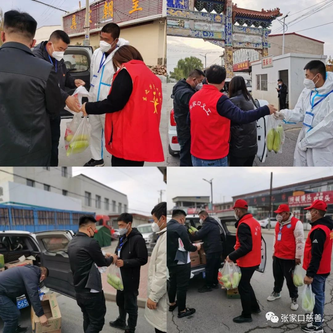 阳慈联副会长弘州爱心队队长张爱生和队员石涛他们知道每位执勤志愿者家中缺菜,俩人就自掏腰包1000多元,经多方努力购买了300多斤新鲜蔬菜,为60多名执勤的志愿者送了暖心的爱心菜,对一直坚守在防控一线的志愿者们来说真是雪中送炭,用实际行动解决了大家的燃眉之急。10月30日,又给执勤的志愿者们送上了爱心菜。