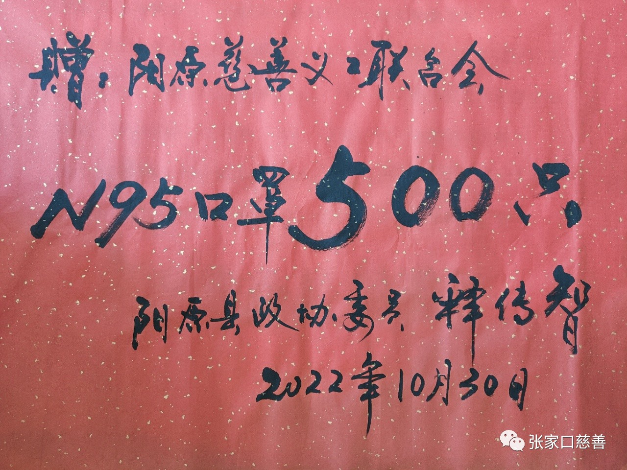 郭海龙说:今天,我们怀着感动之心,感恩之情,举办爱心人士向爱心平台捐赠抗疫物品仪式,向所有关心阳原慈善义工联合会、关心志愿者的各级领导、爱心人士表示衷心的感谢!马雁飞代表释传智先生向阳慈联赠送500只N95口罩,阳慈联会长向释传智先生代表回赠了锦旗牌,刘立东会长发表了热情讲话,他说,释传智先生及爱心人士对阳慈联爱心平台和广大志愿者的关怀让我们倍受鼓舞,这充分体现了志愿者与人民群众心连心的新时代风貌,我们一定不辜负各级领导和社会各界爱心人士的亲切关怀,把爱心口罩及时发放到值勤志愿者手中,以更加饱满的热情战斗在抗击疫情的路上,为夺取疫情防控这场没有硝烟的战争做出新的贡献。