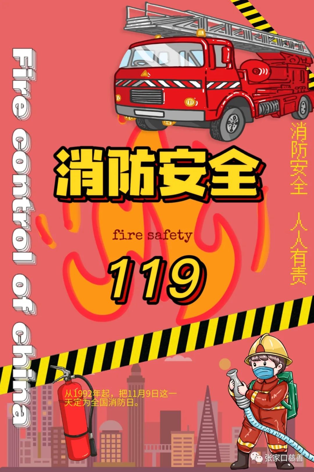 一年一度的消防宣传月又来啦!11月9日的月日数恰好与火警电话号码119相同,而且这一天前后,正值风干物燥、火灾多发之际,全国各地都在紧锣密鼓地开展冬季防火工作。为增加全民的消防安全意识,使"119"更加深入人心,公安部在一些省市进行"119"消防活动的基础上,于1992年发起,将每年的11月9日定为全国的"消防宣传日"。