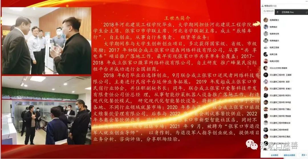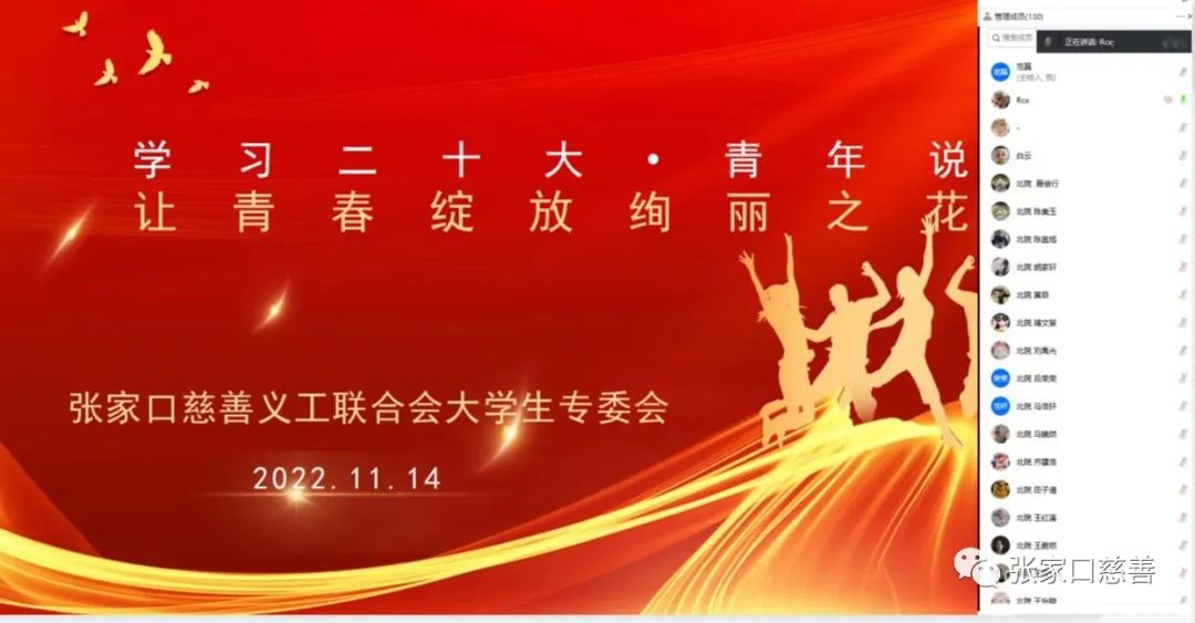 11月14日晚上,大学生专委会利用腾讯会议室线上举办“让青春绽放绚丽之花”学习二十大青年说主题活动。本次活动特邀王世杰和阮崇信两位优秀青年作为主讲嘉宾,参加本次分享会的有来自各学院的老师和学生以及大学生专委会的企业家们,共计130余人,会议由大学生专委会执行会长康俊霞主持。