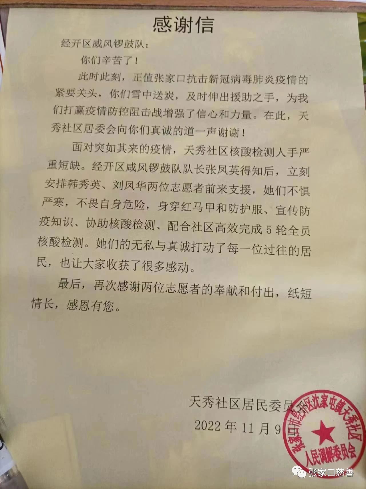 正值张家口疫情防控关键时刻,天秀社区核酸检测人手严重短缺,经开区威风锣鼓队长张凤英获知这一信息后,立即发出通知,安排志愿者增援社区核酸检测工作。志愿者韩秀英、刘凤华二人立即报名,积极踊跃投入到社区核酸检测志愿者行列之中。