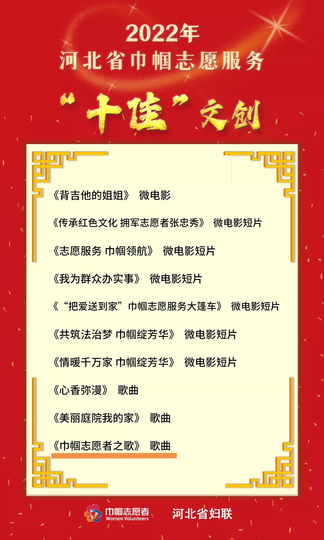为深入学习贯彻落实习近平总书记关于妇女儿童和妇联工作、关于志愿服务的重要指示精神,充分发挥巾帼志愿服务在开展妇女思想政治引领、参与基层社会治理、培养时代新人中的独特作用,省妇联今年组织开展了“巾帼心向党 喜迎二十大”2022年度巾帼志愿服务“五个十”征集展示活动。经过基层择优报送、风采成效展示、接受社会评价、专家综合推选等环节,最终确定了2022年度“河北省巾帼志愿服务十佳个人”“河北省巾帼志愿服务十佳组织”“河北省巾帼志愿服务十佳项目”“河北省巾帼志愿服务十佳社区”“河北省巾帼志愿服务十佳文创”。
