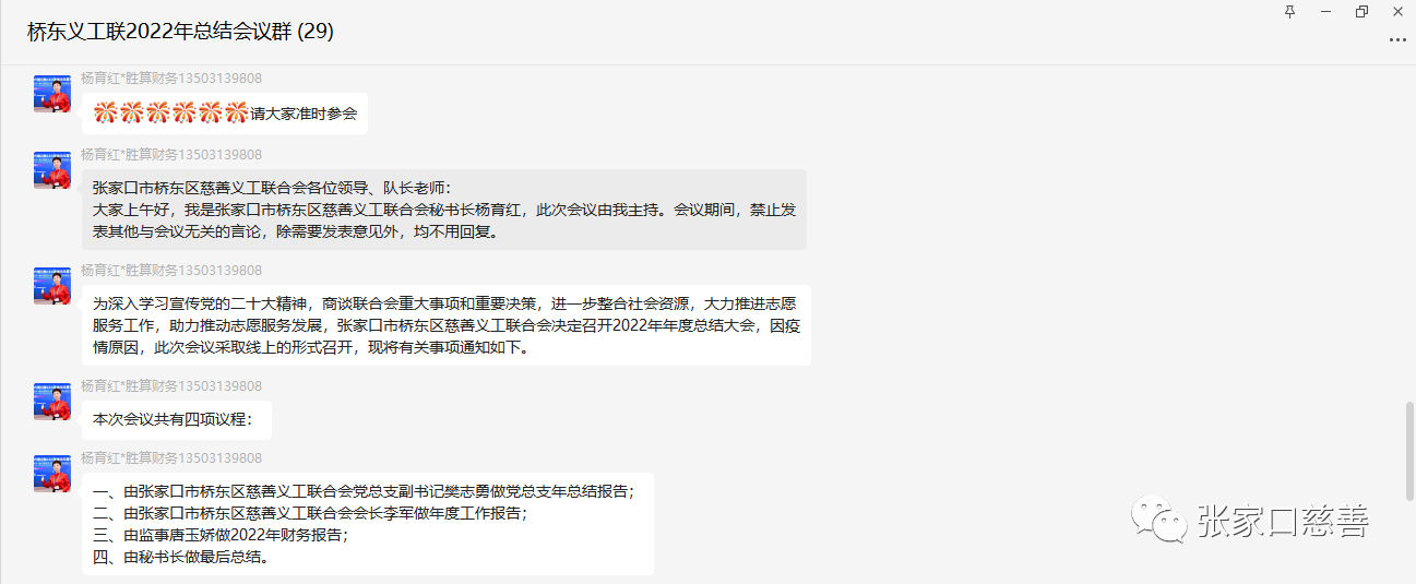 2023年1月5日,张家口市桥东区慈善义工联合会2022年总结会议于线上召开。参加本次会议的有张家口市桥东区慈善义工联合会党支部书记、会长李军、党总支副书记樊志勇、常务副会长张锦陆、副会长王青、刘俊义、康秀红、贾金雁、薛晓芳、田英、李爱富,秘书处杨育红、吴浩然、胡枢、关熙超及各队队长、工青妇负责人共三十人出席会议。会议由杨育红秘书长主持。