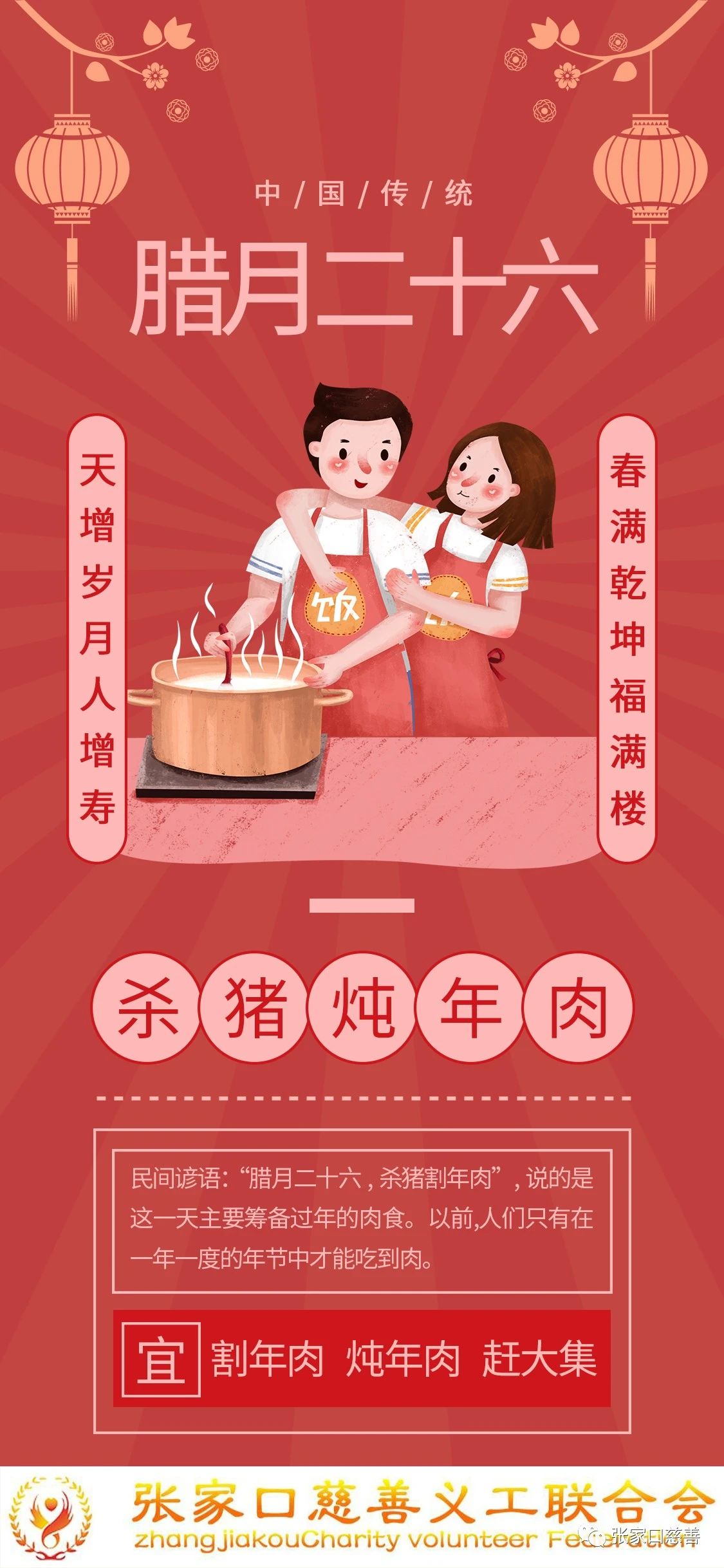在腊月二十六这一天,各地就有了"腊月二十六,里外洗一洗";" 腊月二十六,洗净禽畜屋"之说。关于腊月二十六,民间还流传着"腊月二十六杀猪割年肉"的说法,也就是说,从这一天起要开始置办年货了。在各地乡村,这一天是大集市日,集市周边各村的百姓纷纷前往赶集买年货,烟、酒、鱼、肉、鞭炮和走亲戚用的礼品一样也不能少,年味已渐浓了起来。
