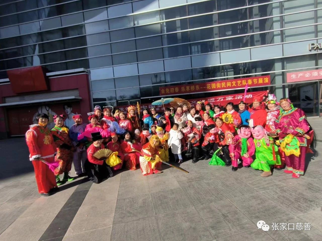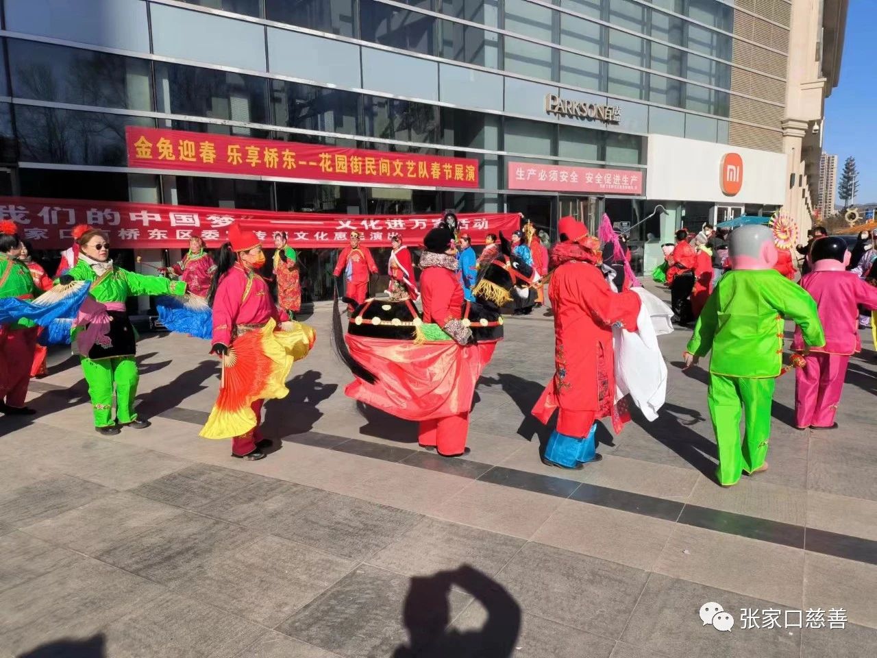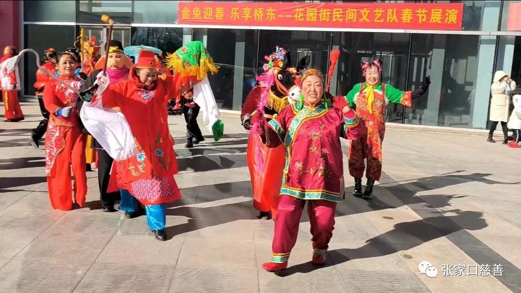 1月25日至27日,爱宝队姜海萍、李晓霞、任芳、陈旭、马慧东等15位文艺爱好者和其他秧歌队员共同组成花园街民间文艺队,在百盛购物中心东门表演秧歌舞。寒冷的天气阻挡不了大家火热的心,连续三天,大家身着各式秧歌服,扮演各种角色,有传统秧歌、大头娃娃、媒婆说媒,状元娶亲,也有唐僧师徒拜年、五人猪八戒、仙女下凡等表演秧歌,精彩的表演,引来路人的驻足围观,不仅为春节增加了几分喜气!也展示了张家口的年俗文化。